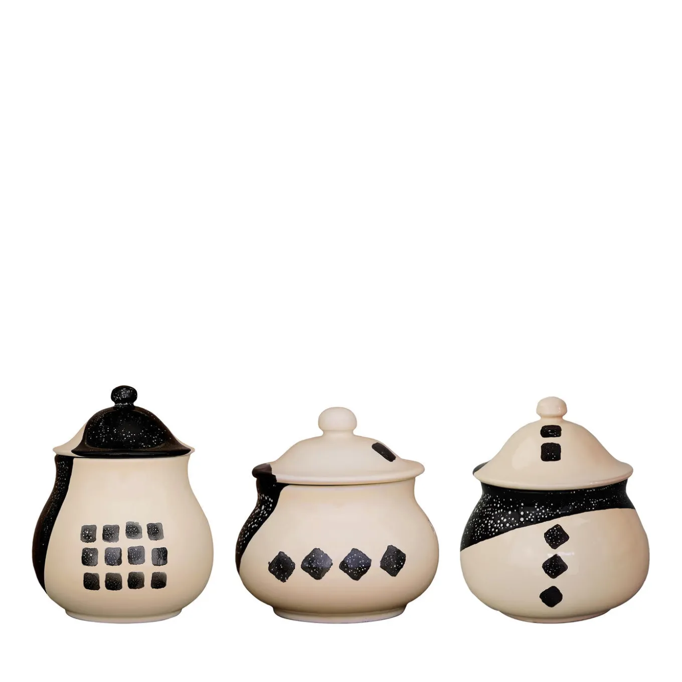 Quando la tradizione artigianale incontra l’arte contemporanea, nascono oggetti d’arredo funzionali, unici e raffinati. Nato dalla collaborazione tra i Fratelli Colì e Kiasmo, questo set da tavola in ceramica comprende tre ciotole con coperchio destinate rispettivamente alla conservazione delle cipolle (18 x 18 x 14 cm), dell’aglio (13 x 13 x 16 cm) e del peperoncino (11 x 11 x 11 cm). Ogni pezzo è interamente lavorato e dipinto a mano.
