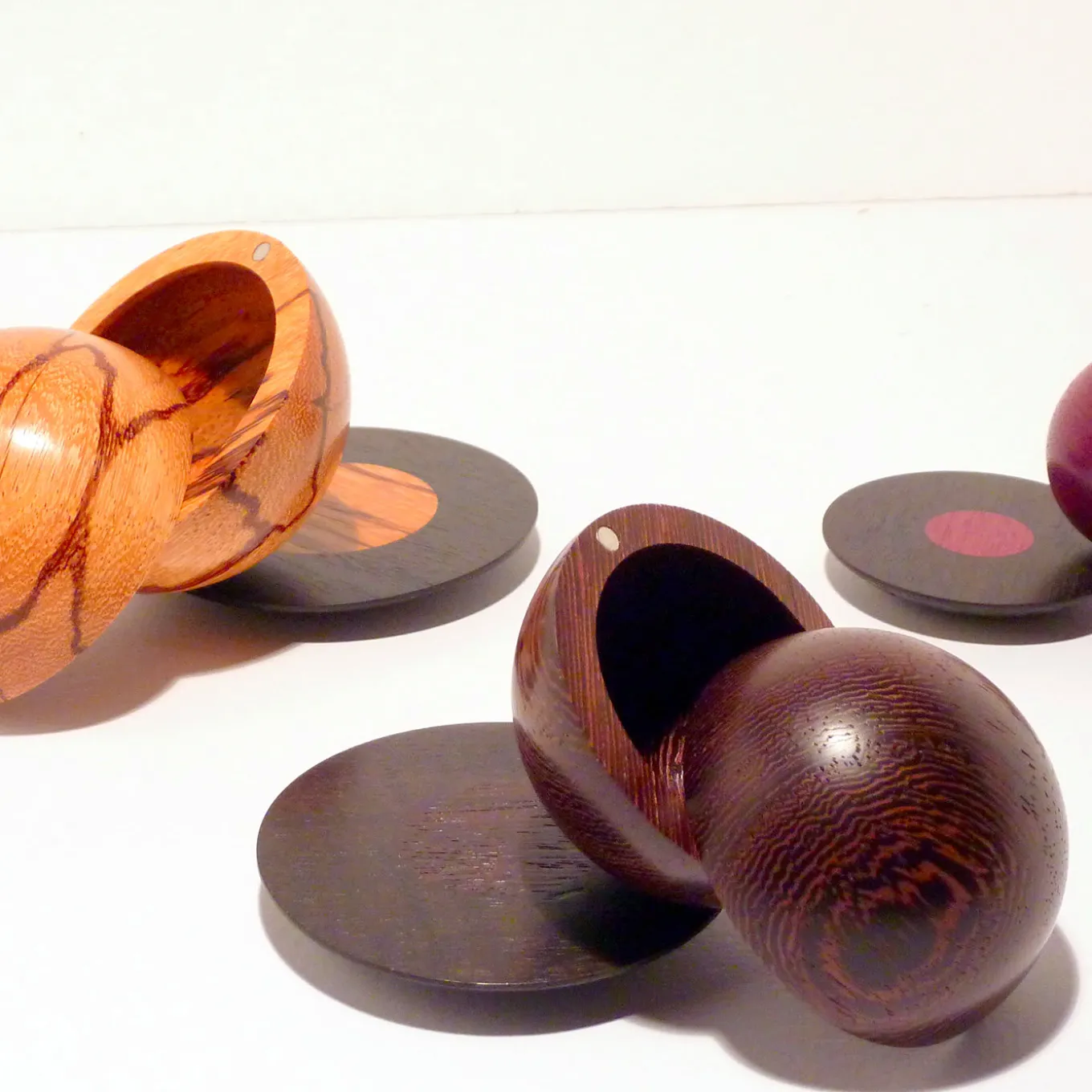 Squisitamente lavorati a mano al tornio, questi contenitori sono composti da due emisferi sostenuti da tre piccoli magneti al neodimio che formano una forma perfettamente sferica quando vengono chiusi insieme. La base rotonda e strutturata in ebano di Camerun evoca la superficie lunare e completa i legni pregiati e distintivi delle tre sfere in dimensioni crescenti: Purpleheart (⌀ 70 mm), Wengè (⌀ 58 mm) e Marblewood (⌀ 40 mm).