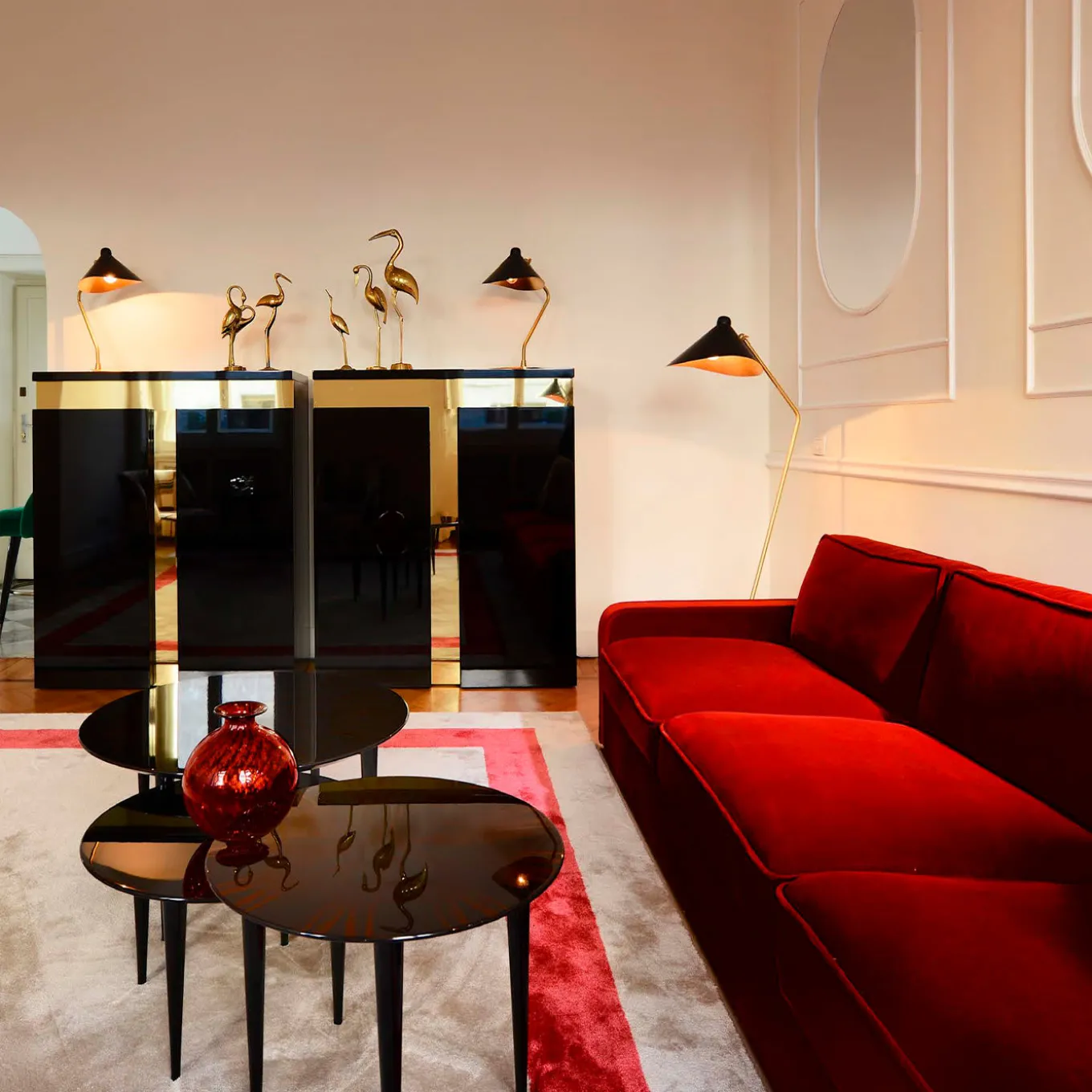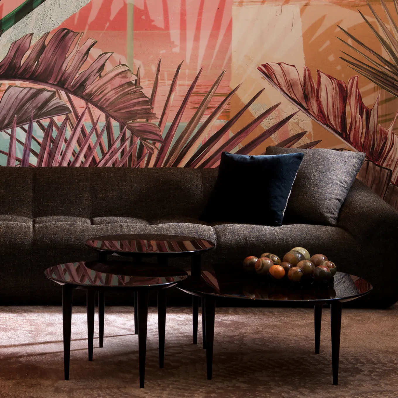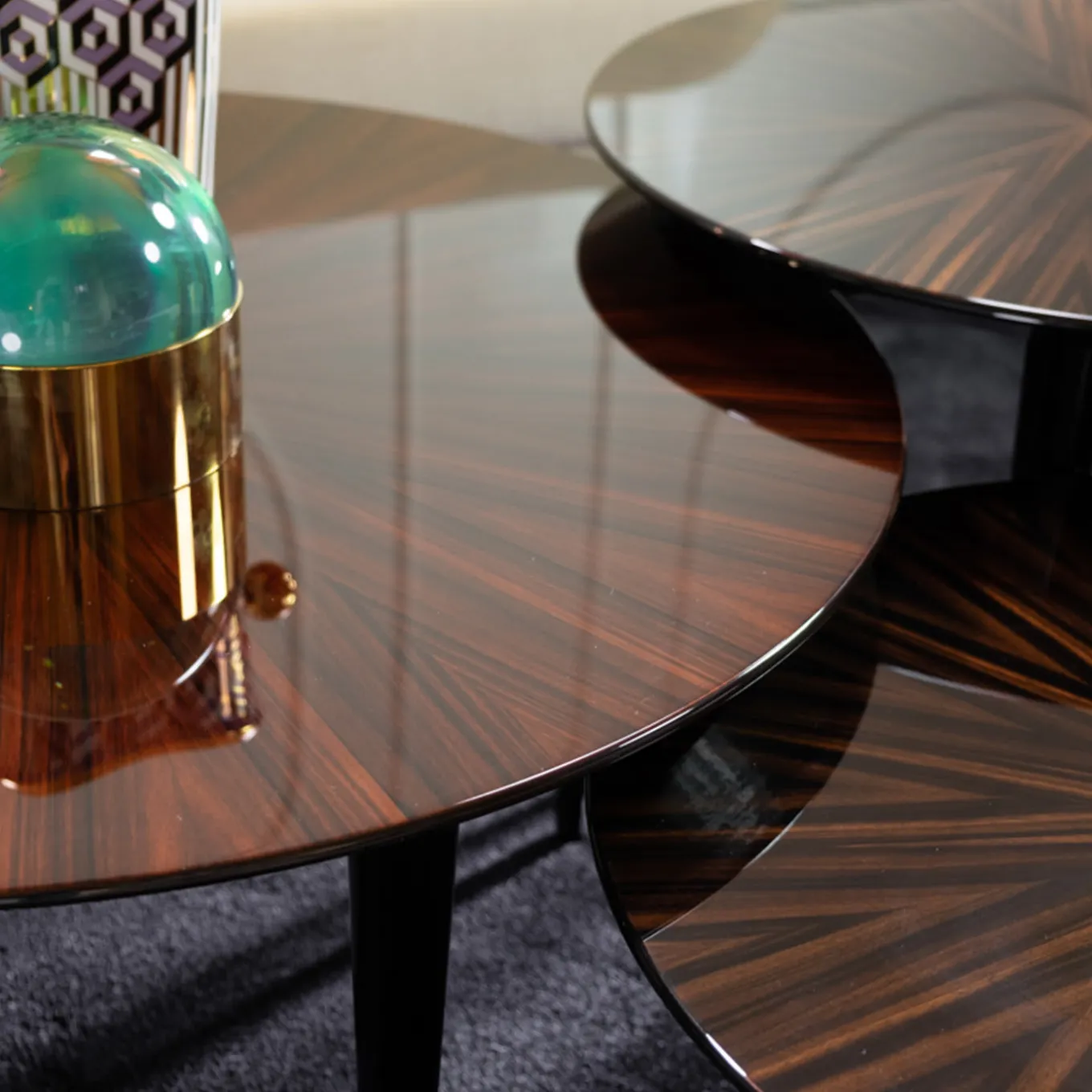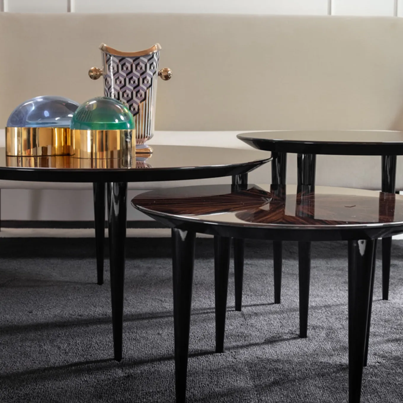 Parte della serie Pierrot, questo trio di tavolini vanta una squisita lavorazione artigianale e l’utilizzo del pregiato ebano Macassar. Il design di ogni pezzo, ispirato al fascino romantico della celebre maschera francese da cui prende spunto, è una delicata combinazione di piano rotondo e gambe affusolate, intercambiabili e decorate con lacca nera lucida. La decorazione a raggiera sui piani è eseguita con maestria. Le misure dei pezzi sono: Ø80 x H35 cm, Ø56 x H40 cm e Ø 56 x H45 cm.