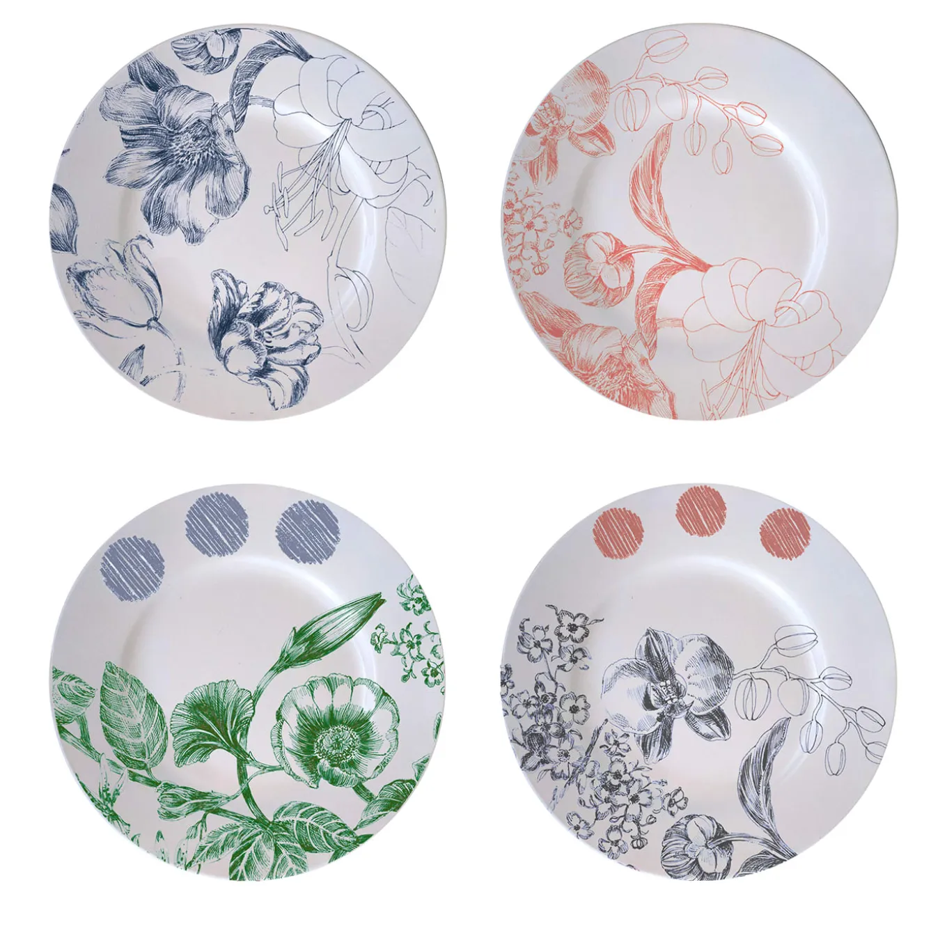 Straordinariamente dipinto a mano su una superficie elegante e luminosa di porcellana bianca, ogni piatto da pane di questo pregiato set di quattro si distingue per una diversa decorazione floreale resa in vibranti tonalità di blu, verde e rosso. Realizzato a mano con minuziosa attenzione ai dettagli, appartiene alla raffinata serie di porcellane Marie Antoinette.