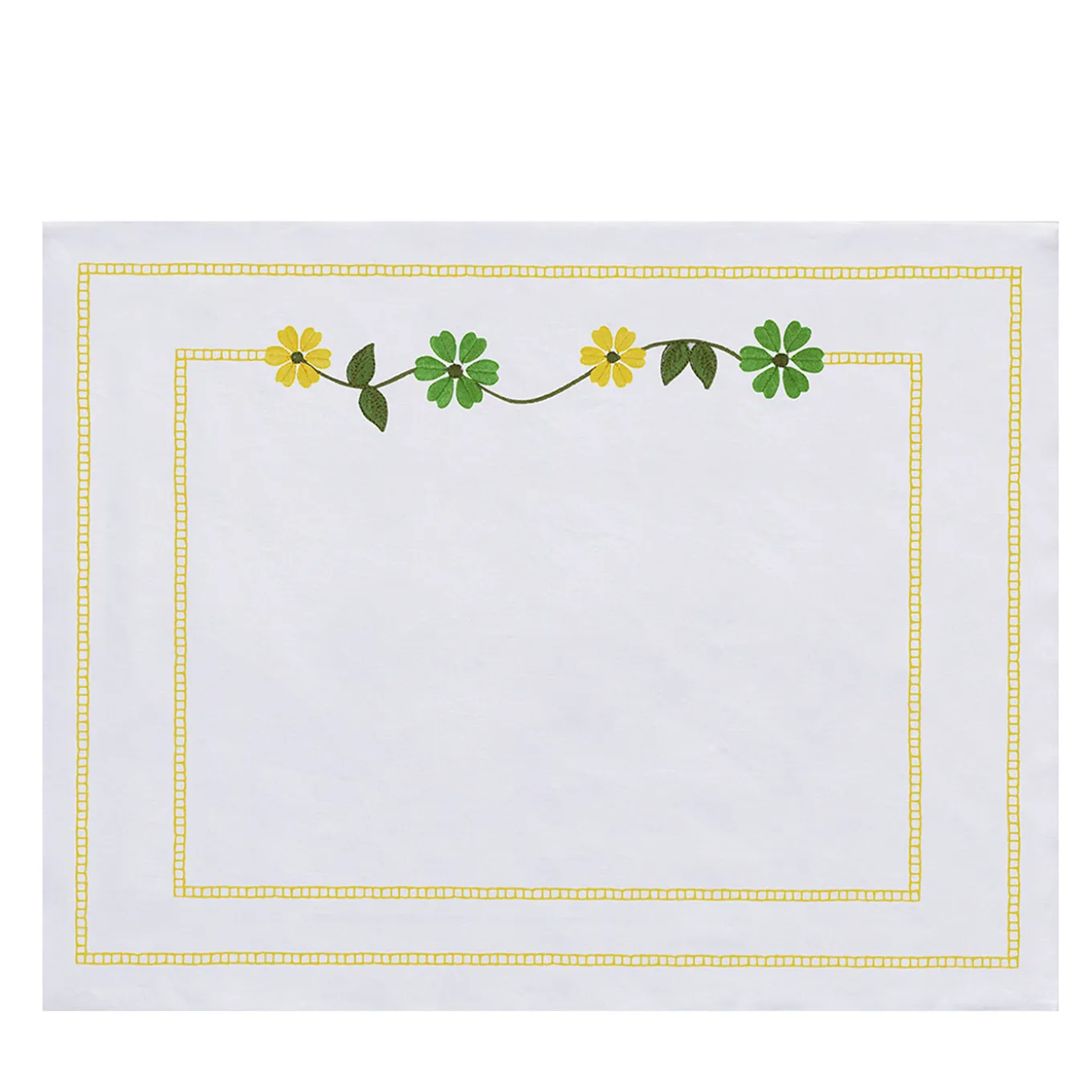 Set di 4 tovagliette in lino ricamati che presentano un delicato motivo di fiore di margherita ispirato alla flora della Puglia. Realizzati con attenzione ai dettagli, ogni sottopiatto mette in mostra un ricamo vibrante giallo e verde incorniciato da una fine bordura gialla, simbolo di gratitudine e celebrazione. Queste tovagliette, pensate per apparecchiature eleganti, fondono stile e tradizione per arricchire ogni momento a tavola.