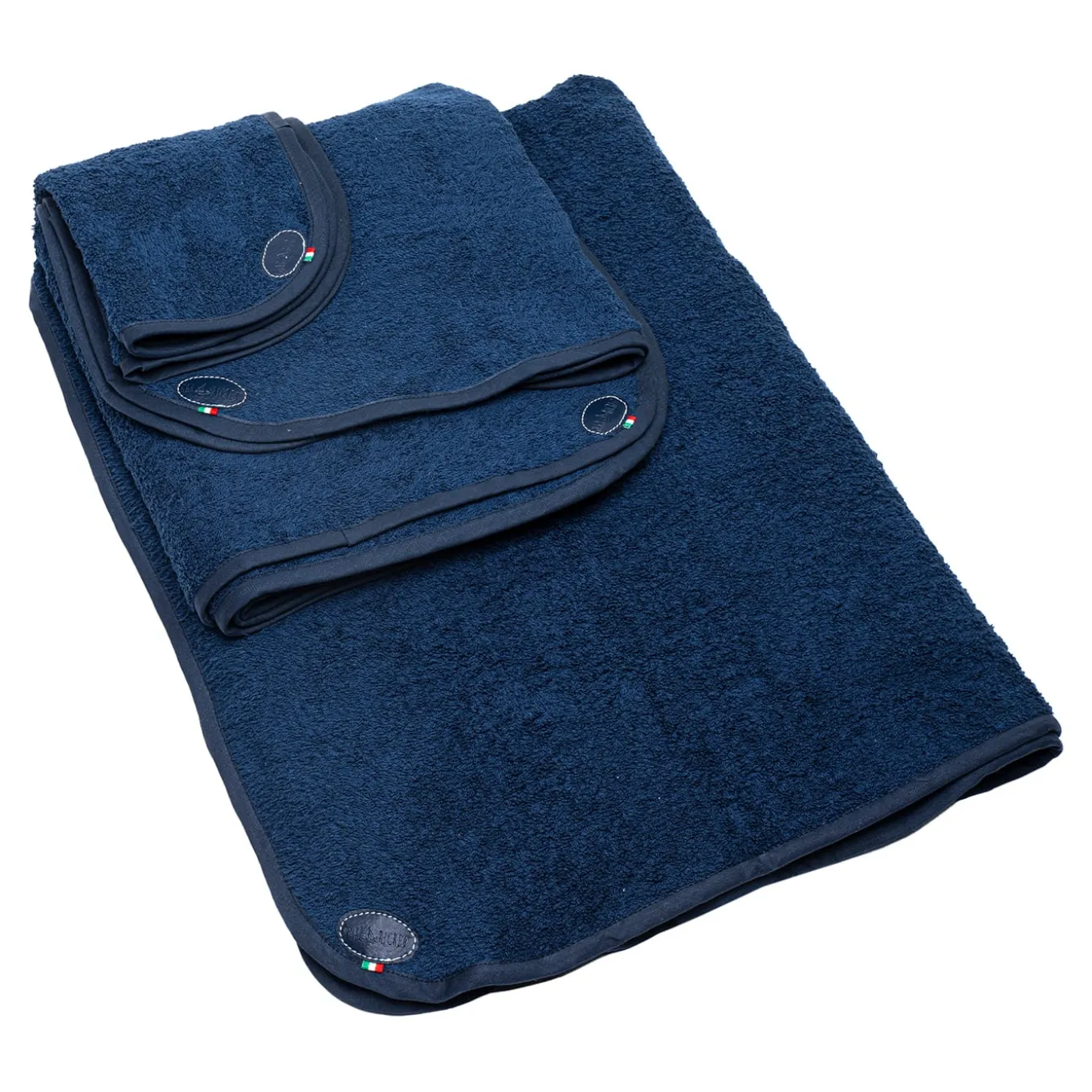 Questo set di asciugamani, che si distingue per l’intensa tonalità di blu che evoca gli oceani e per l’alta qualità dei filati, darà un tocco di esclusività all’arredamento della cucina o del bagno. Gli inserti ovali in pelle, abbinati a delicate riproduzioni della bandiera italiana, riportano il logo del marchio, che suggella la qualità sartoriale del set, composto da due strofinacci (29×29 cm), un asciugamano per le mani (110×61 cm), un telo mare/bagno (155×98 cm) e uno piccolo (60×43 cm).