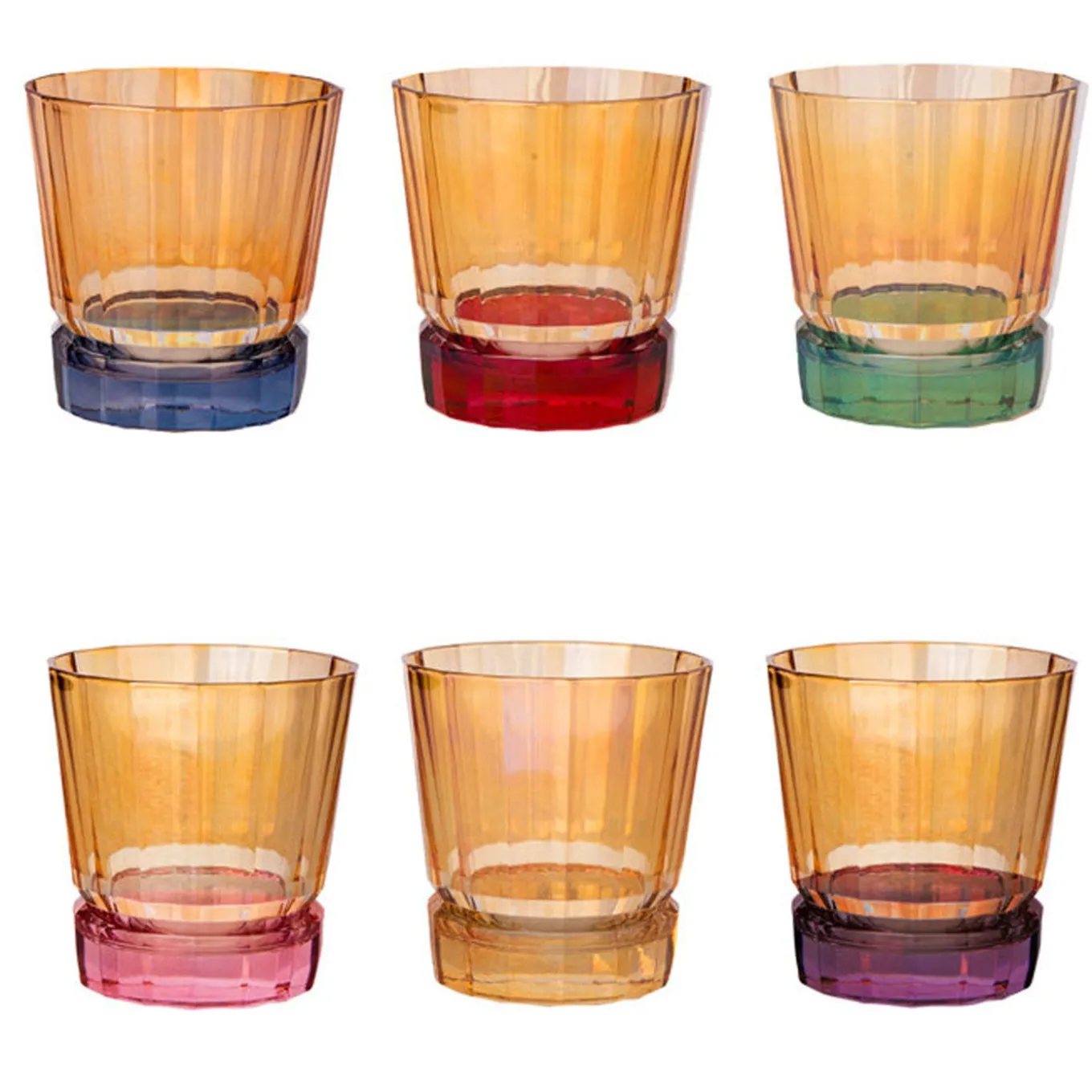 Un arcobaleno di colori che animerà ogni occasione, questo set di sei bicchieri da acqua è elegante ed eclettico. Può essere utilizzato tutti i giorni o, abbinato agli altri set della stessa collezione Madagascar, per creare un effetto suggestivo su una tavola dai toni neutri o monocromatici. I pezzi sono realizzati in cristallo e decorati interamente a mano e vantano una base a zoccolo colorata, che segna con un carattere individuale ogni bicchiere, sostenendo una coppa dorata. Ogni bicchiere misura 10 cm di altezza.