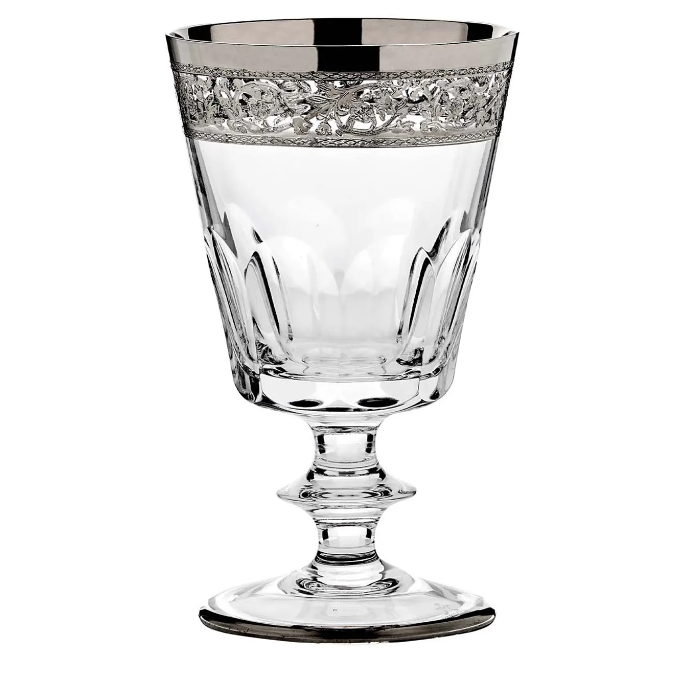 Questo esclusivo set di sei calici in cristallo per la mescita del vino è un superbo esempio di design tradizionale arricchito da un tocco opulento. Il platino brillante è applicato con minuziose pennellate alla base, al bordo e al motivo floreale pantografato di inconfondibile ispirazione barocca. Definiti da un passo sinuoso e da una texture morbidamente sfaccettata sulla superficie inferiore della coppa, questi bicchieri distillano un fascino nobile.