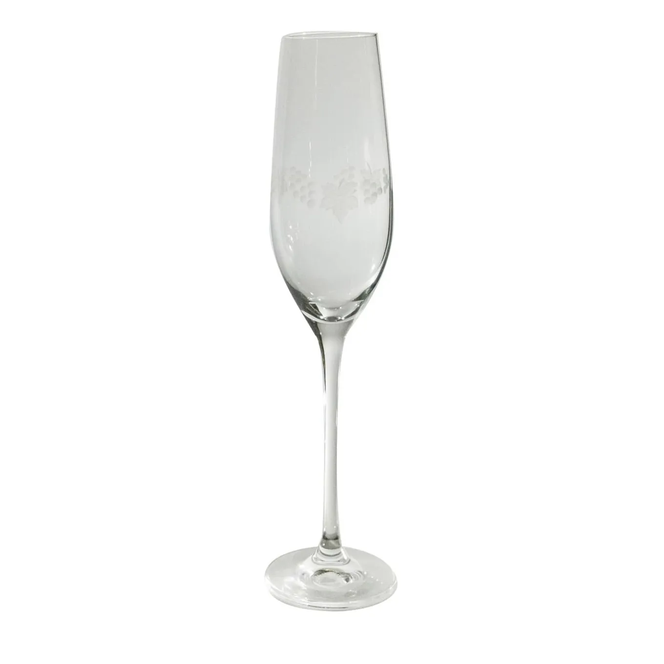 Ricco di una raffinatezza senza tempo, questo set di sei flute in vetro trasparente soffiato a bocca è in grado di infondere a qualsiasi tavola una tranquilla raffinatezza. Perfetti per brindisi speciali, i bicchieri (210 ml) sono minuziosamente decorati con una ghirlanda di foglie di vite delicatamente incise e grappoli d’uva matura. È disponibile anche un set da acqua composto da bicchieri a stelo, per un look più coeso.