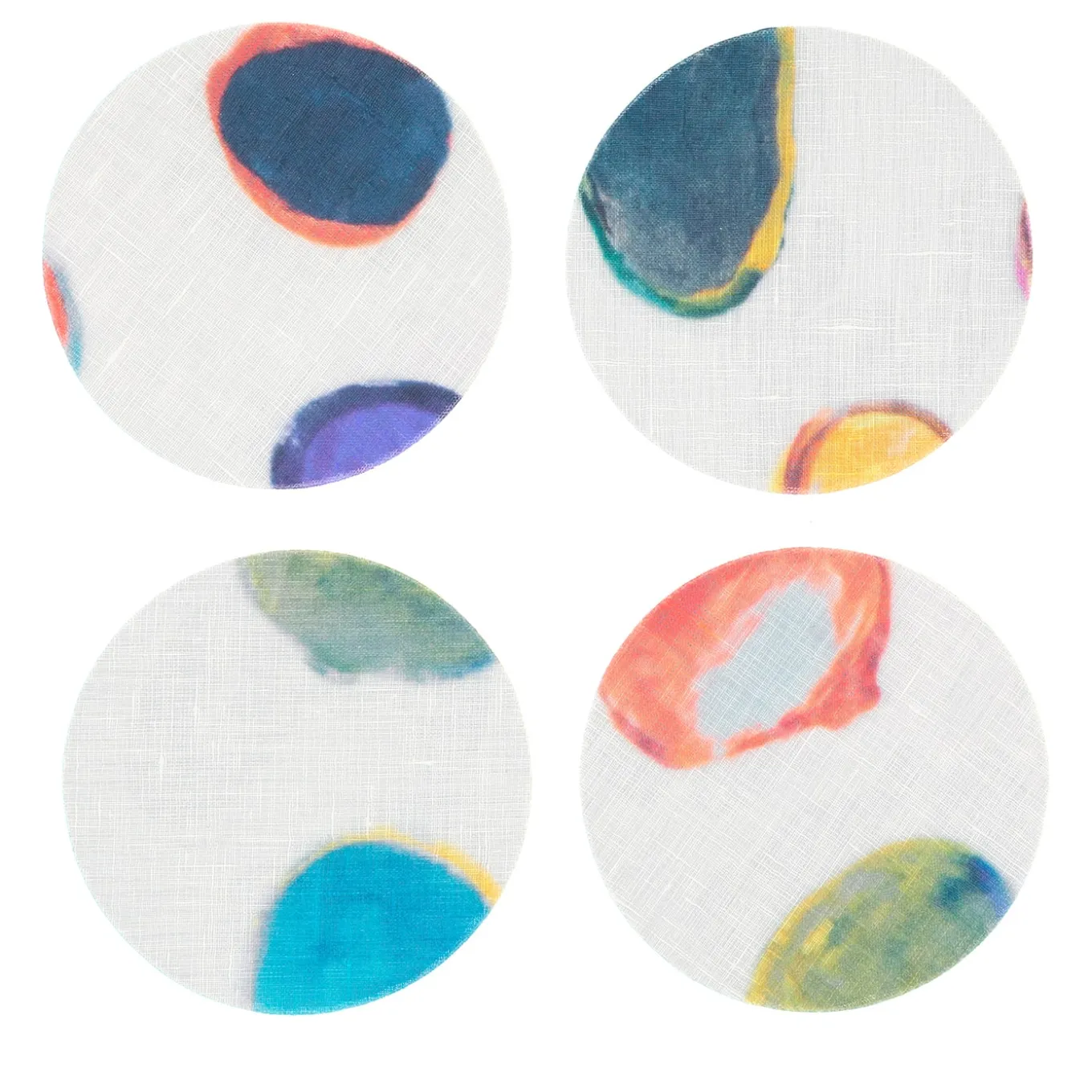 Questa opera d’arte originale di Luisa Longo, dipinta a mano, è stata stampata in digitale su lino; ogni pezzo è stato tagliato da un motivo molto grande, per cui tutte le stuoie saranno diverse l’una dall’altra, formando una tavola unica. Il tessuto è stato inglobato in un’esclusiva soluzione poliuretanica con la più morbida sensazione di pelle di pesca. I sottobicchieri hanno una straordinaria resistenza al calore, alle abrasioni e alle macchie, leggeri e totalmente flessibili, possono essere lavati semplicemente con una goccia d’acqua e sapone.
