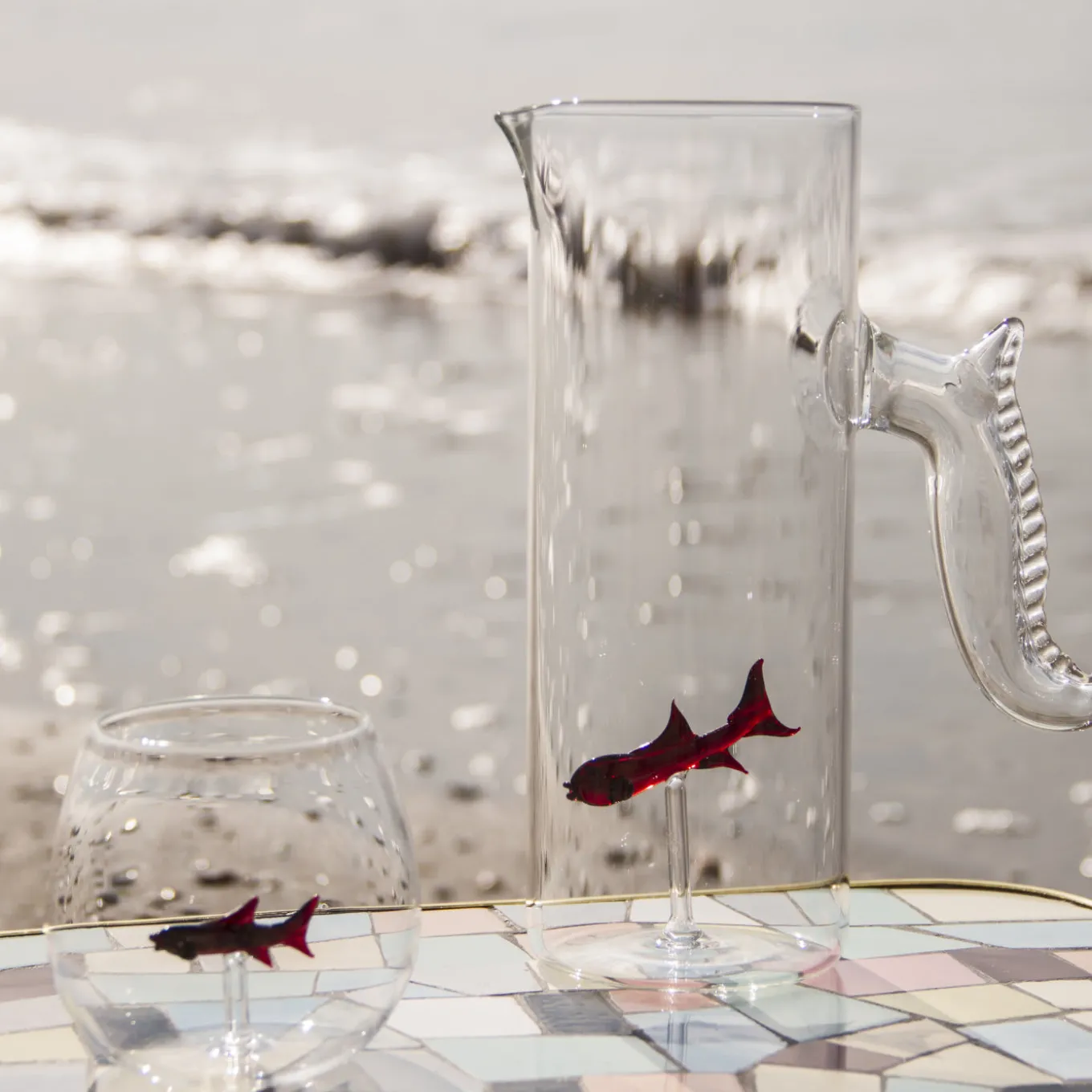 Questo set di pesciolini aggiungerà un tocco colorato e stravagante a qualsiasi tavolo da pranzo. L’alta brocca trasparente è caratterizzata da un manico nautico e condivide con i bicchieri l’aggiunta di un pesce in vetro squisitamente reso che sembra galleggiare grazie a un piccolo supporto in vetro alla base. I dettagli precisi di questi pezzi soffiati a bocca rendono questo set davvero unico.