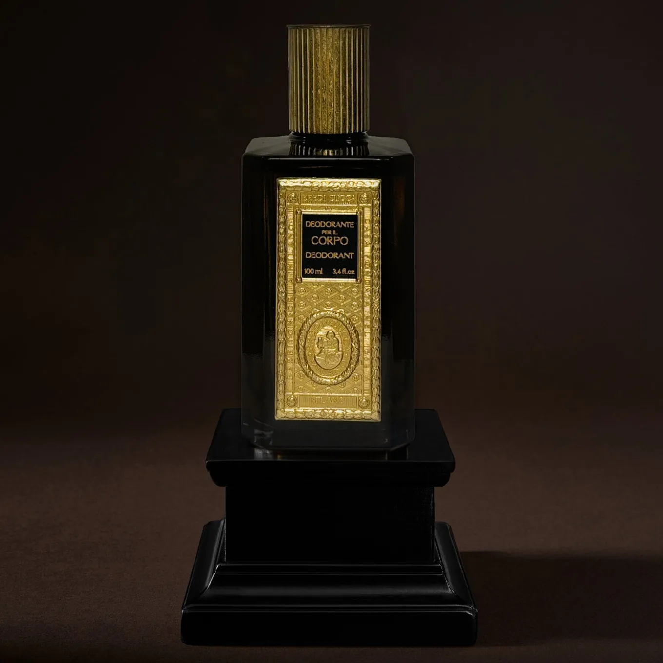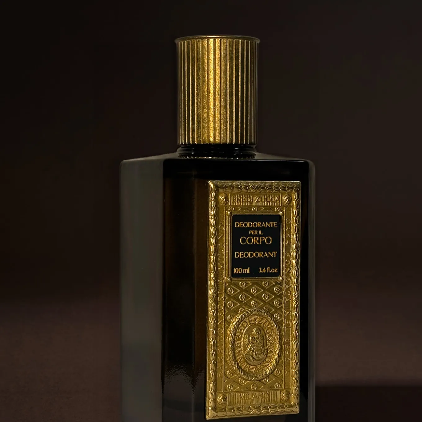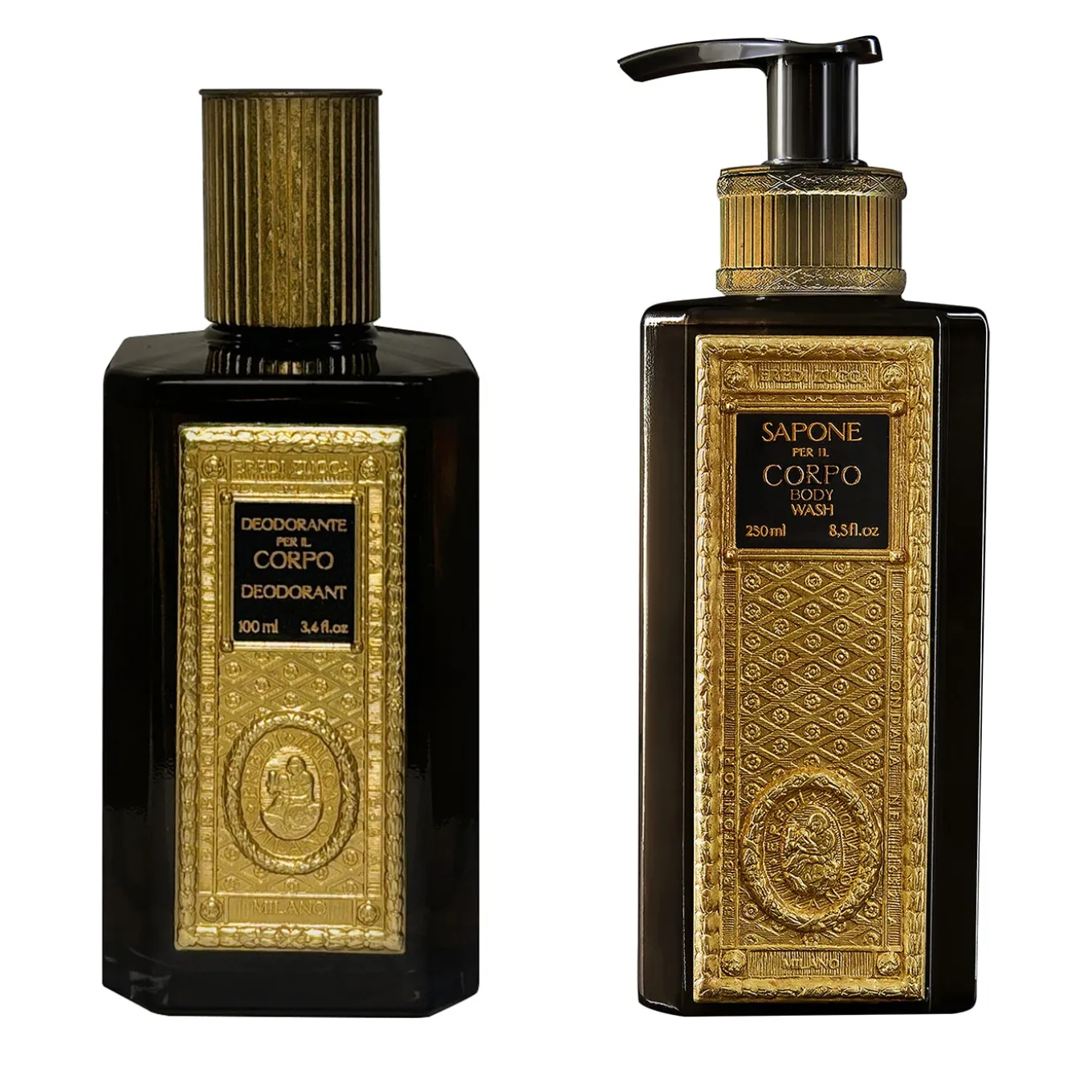Il set Eredi Zucca deodorante (100ml) e detergente per il corpo (250ml) offre un approccio lussuoso ma delicato alla cura quotidiana. Il deodorante, a basso contenuto alcolico e senza alluminio o antitraspiranti, assicura una freschezza duratura rispettando l’equilibrio della pelle. Il detergente cremoso per il corpo nutre senza eliminare gli oli naturali. Entrambi sono arricchiti con bergamotto, lavanda e salvia, infusi con la fragranza floreale-agrumata Bigli, e presentati in eleganti flaconi impreziositi da dettagli in ottone Eredi Zucca.