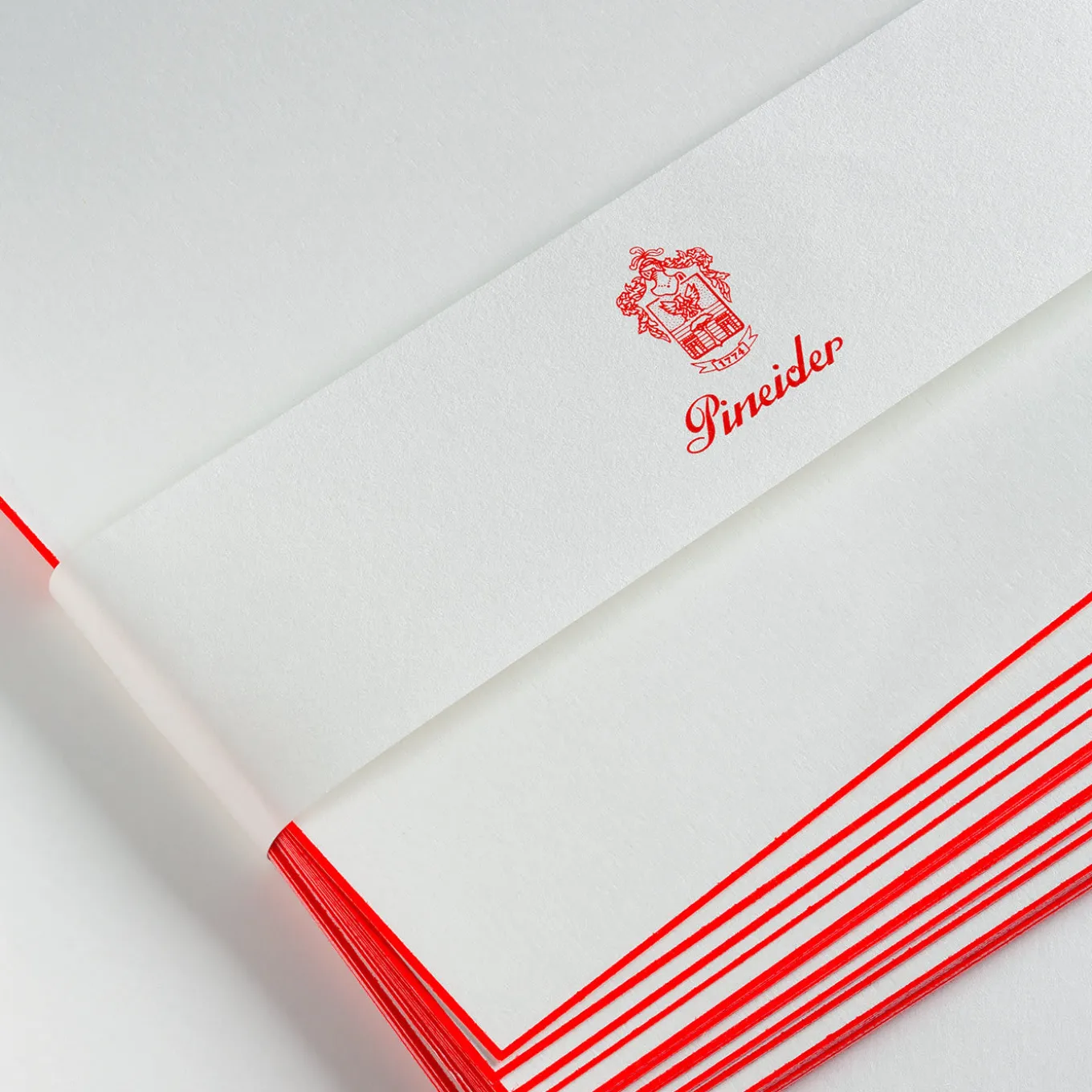 Questo set di carta da lettere unico, ispirato agli ipnotici paesaggi dell’isola di Capri, comprende un cofanetto raffigurante gli iconici “Faraglioni” (l’iconico scoglio sul mare dell’isola) con dettagli rosso vivo e 24 fogli in carta Pineider liscia e filigranata, con taglio netto e bordatura a mano in tinta con il rosso del cofanetto. Il set è corredato da 24 buste foderate di carta velina rossa tenute insieme da fiocchi di seta annodati a mano, il cui colore si abbina alla bordatura. Questo set è disponibile in altre combinazioni di colori; per informazioni, rivolgersi al Concierge.