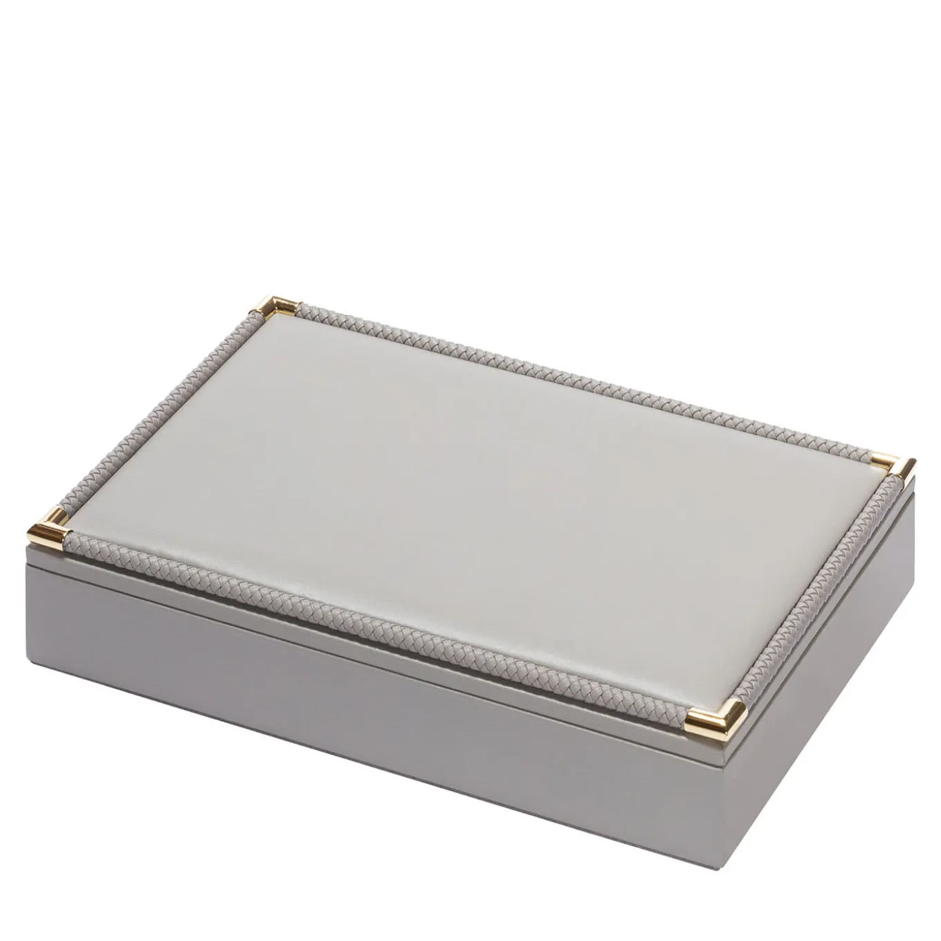 Scatola in pelle con finiture in pelle intrecciata e dettagli in metallo cromato o dorato. Set dotato di pezzi di domino in plexiglass lucido ad alta resistenza: scegliere tra finitura nera o bianca.