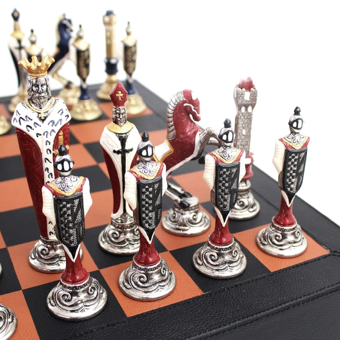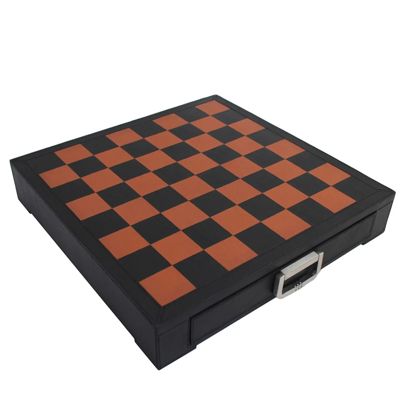 Lo stile fiorentino è splendidamente esemplificato da questo esclusivo set di scacchi in cui ogni scacchista in metallo è minuziosamente dipinto a mano. Magistralmente cucita e rifinita a mano, la scacchiera in pelle bicolore – che misura cm 48x48x6 – dichiara in modo inequivocabile il prezioso gusto sartoriale del set. I cassetti per riporre gli scacchi completano il design. I re sono alti cm 13,6.
