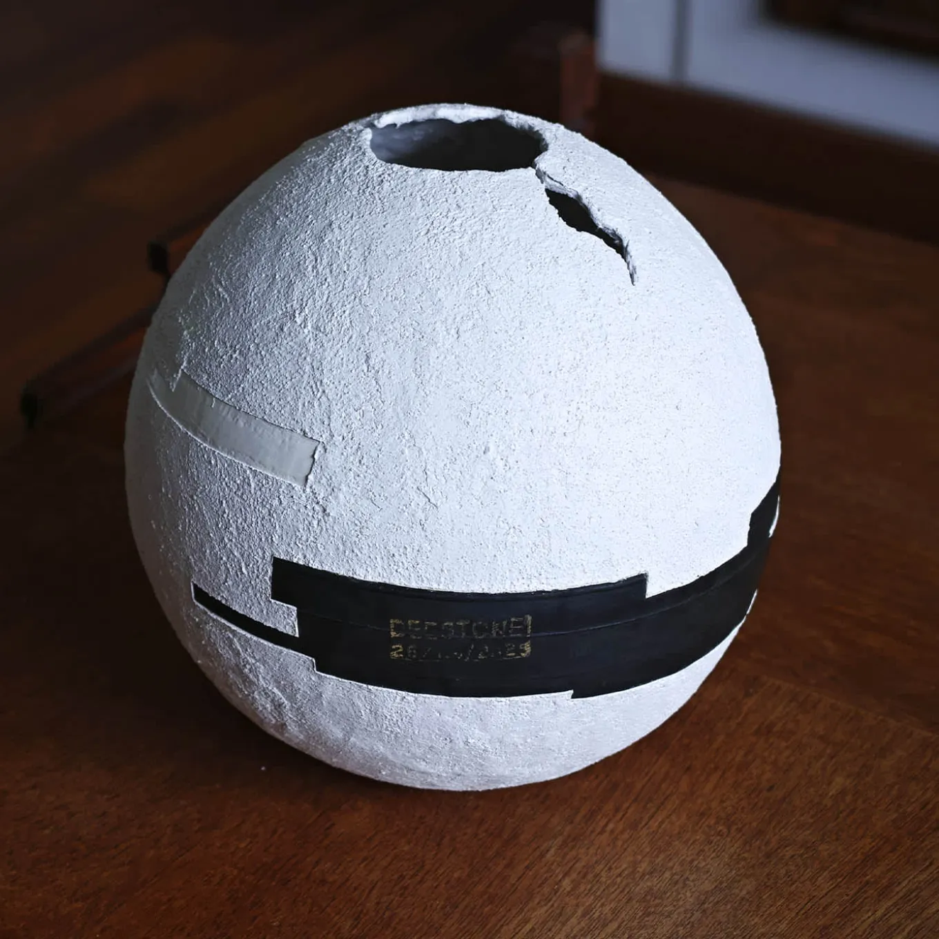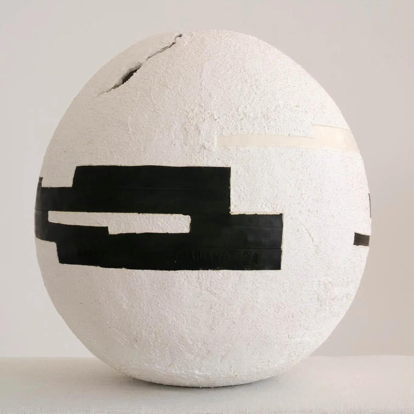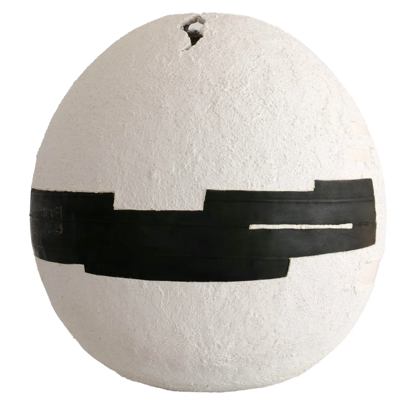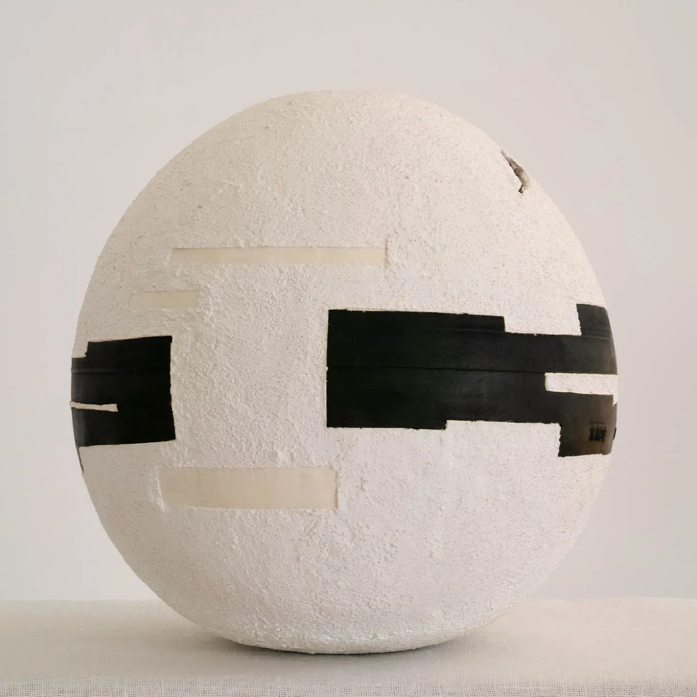 Questa particolare sfera, interamente realizzata a mano con cemento, polvere di marmo bianco di Carrara e polvere di ceramica, è un capolavoro di texture e geometria. Una fessura verticale divide la superficie superiore, mentre l’esterno è rivestito da uno strato di cemento bianco granulare. Il design è impreziosito da inserti geometrici neri ricavati da camere d’aria di pneumatici, abbinati a quattro strisce di smalto bianco lucido. Nonostante la costruzione in materiale grezzo, questa sfera è leggera ma delicata e richiede un’attenta manipolazione.