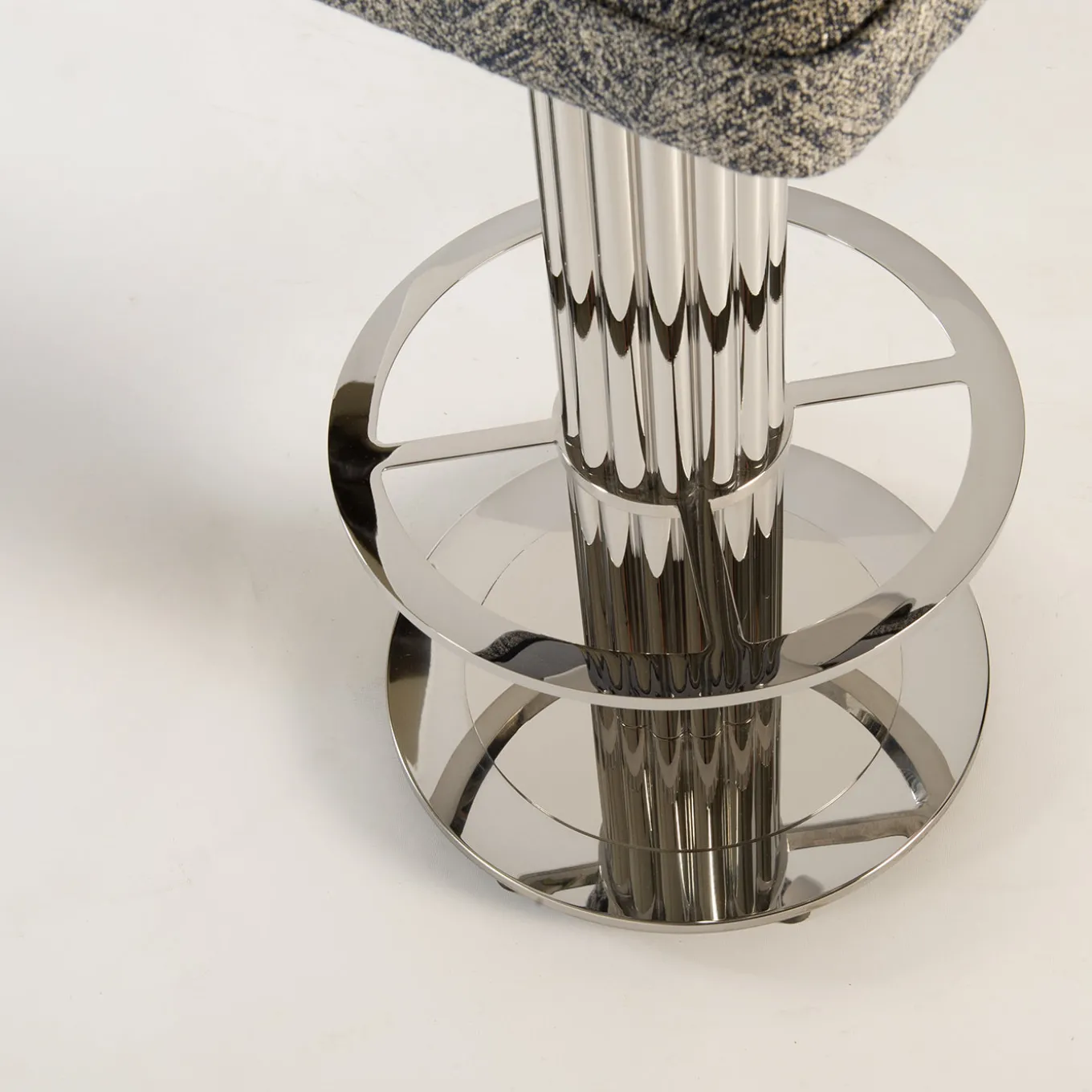 Lo sgabello da bar Alisa in ottone presenta una struttura in acciaio cromato con una finitura argentata lucida. Lo sgabello è progettato con una base rotonda e un supporto circolare per i piedi attorno alla colonna centrale. Il sedile e lo schienale tappezzati in un tessuto testurizzato offrono comfort mantenendo un aspetto contemporaneo. Adatto per uso interno ed esterno, questo sgabello di dimensioni medie bilancia durabilità e stile raffinato.