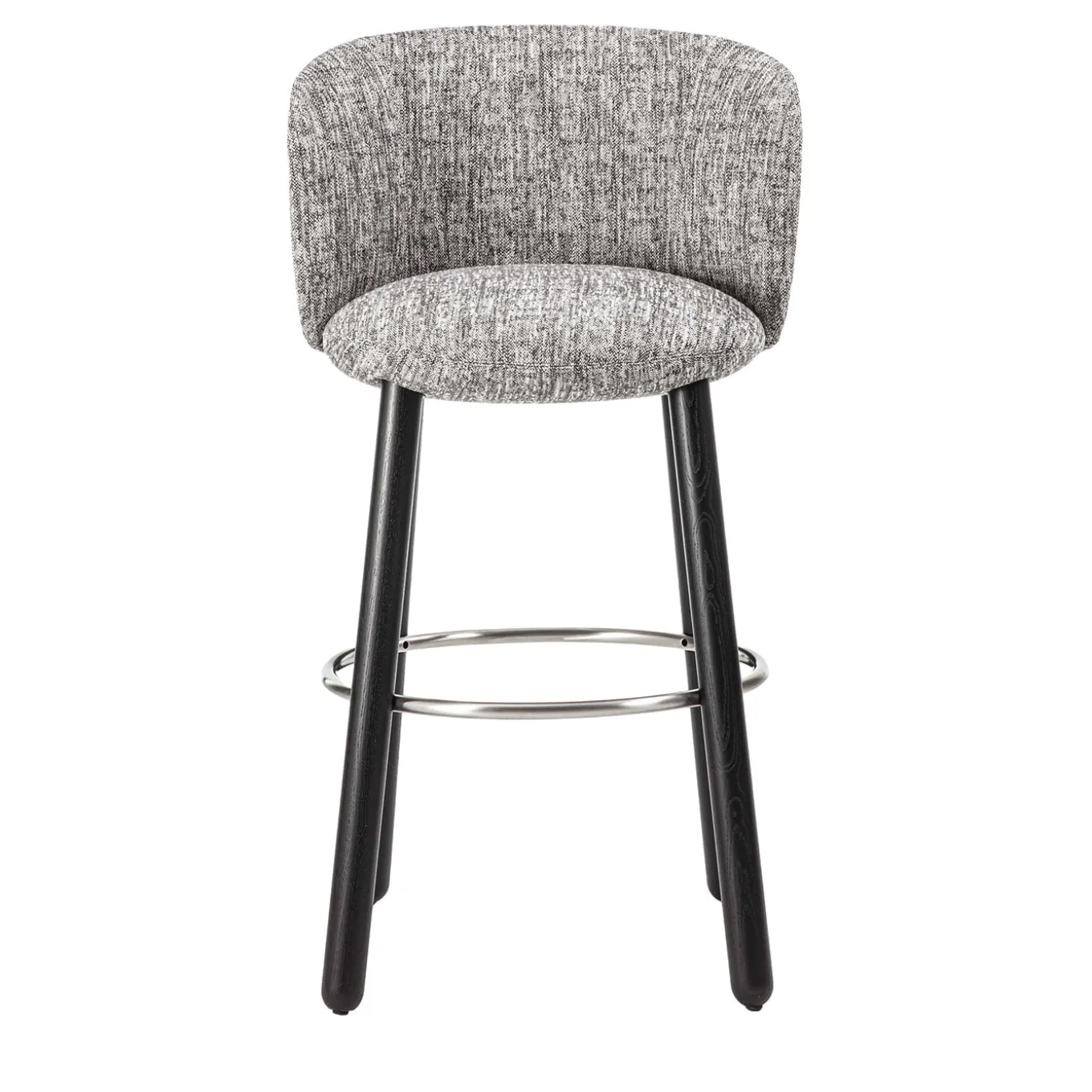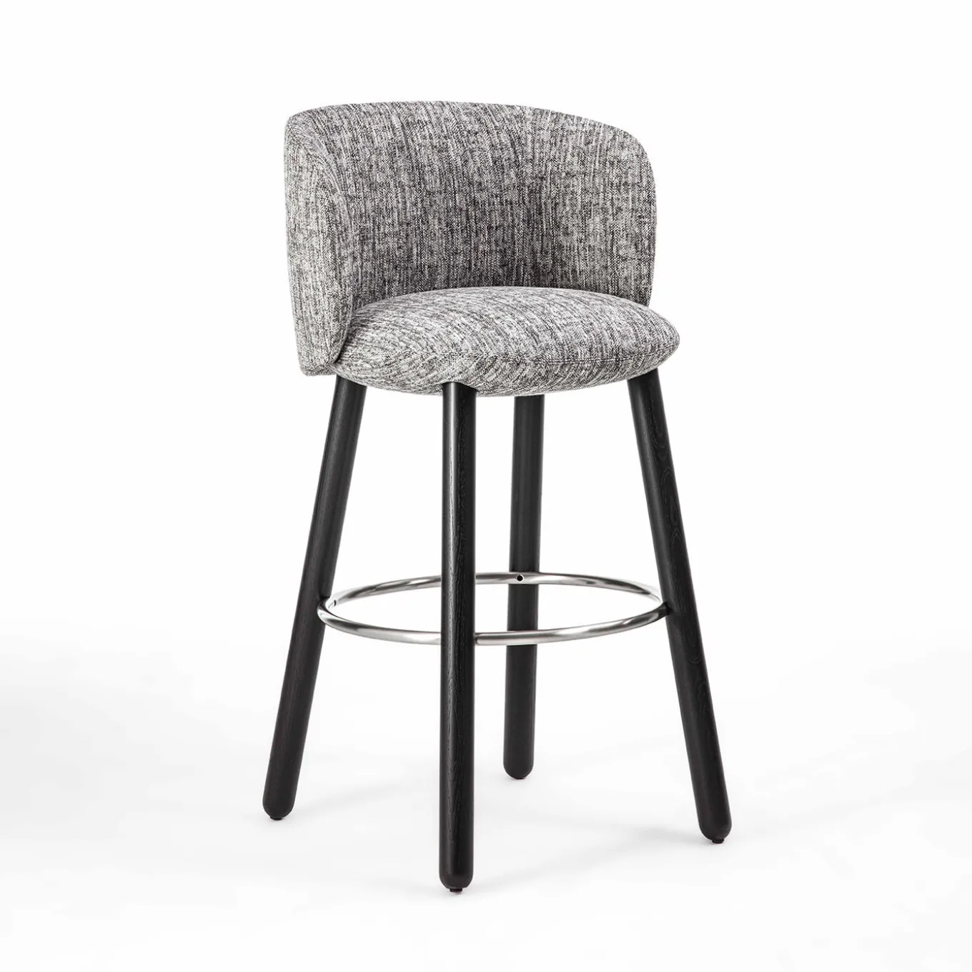 Seduta unica con struttura in acciaio, imbottitura in poliuretano espanso rivestita in materiale diverso. Questo sgabello combina design moderno e materiali di alta qualità, rendendolo un elemento distintivo per qualsiasi spazio. Base a quattro gambe in legno tornito disponibile in frassino o noce canaletto.
