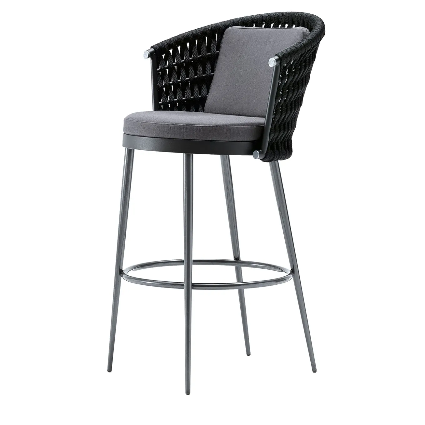 Questo sgabello da bar per esterni è caratterizzato da gambe e struttura in metallo nero satinato trattato in cataforesi. La seduta posteriore è in cordame intrecciato nero. Speciale copertura per esterni inclusa nel prezzo. Design di Castello Lagravinese Studio.