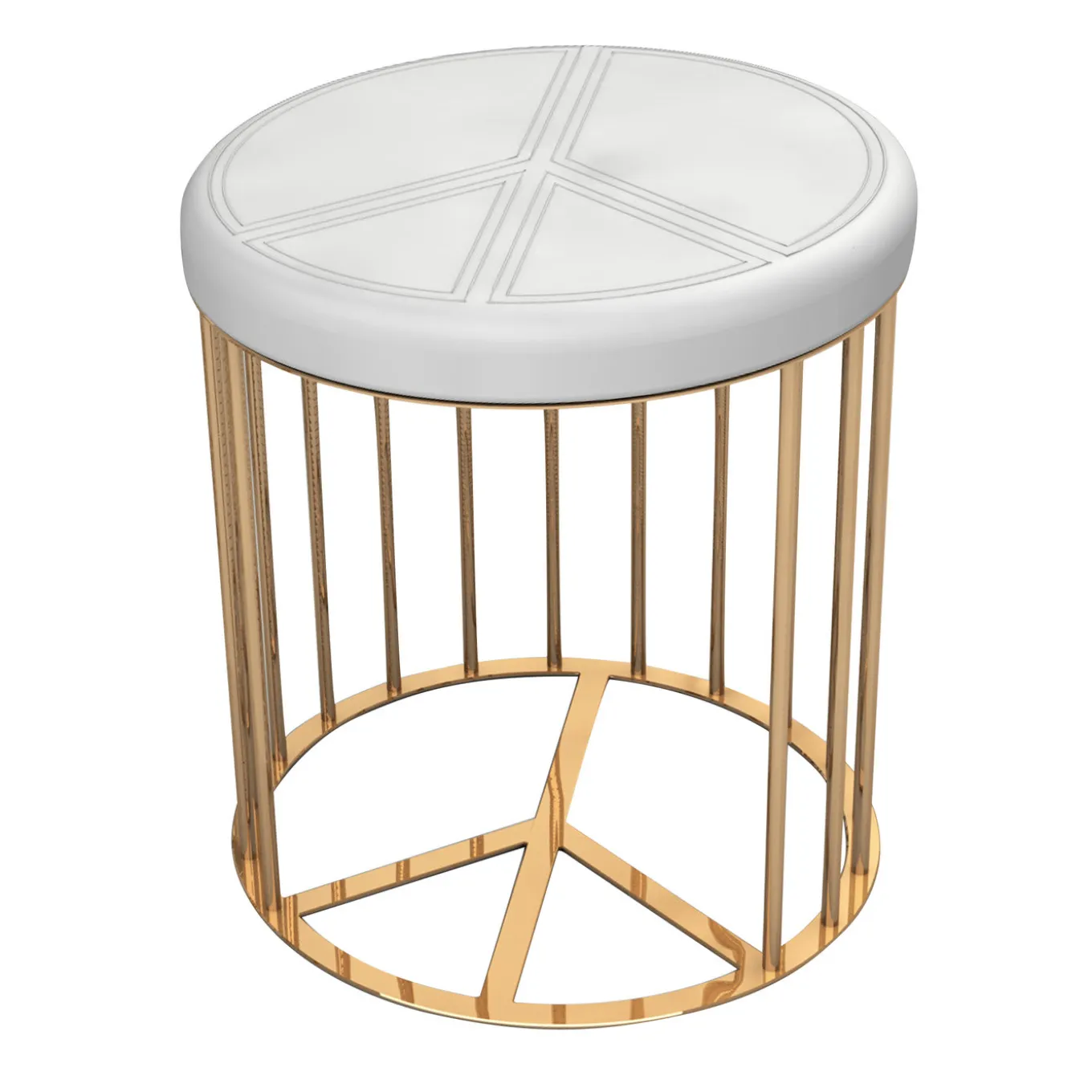 Complemento di tendenza per un patio, una piscina all’aperto o accento raffinato per una vanità, una cabina armadio o una camera degli ospiti, questo pouf in alluminio sarà un pezzo di stile in qualsiasi arredamento. La struttura rotonda ha una finitura dorata lucida ed è composta da aste cilindriche che collegano la base e la parte superiore a forma dell’iconico segno della pace. Questo pezzo divertente ma raffinato è completato da una seduta rivestita in pelle bianca che reca un ricamo tono su tono dello stesso segno della pace. Adatto sia per interni che per esterni.