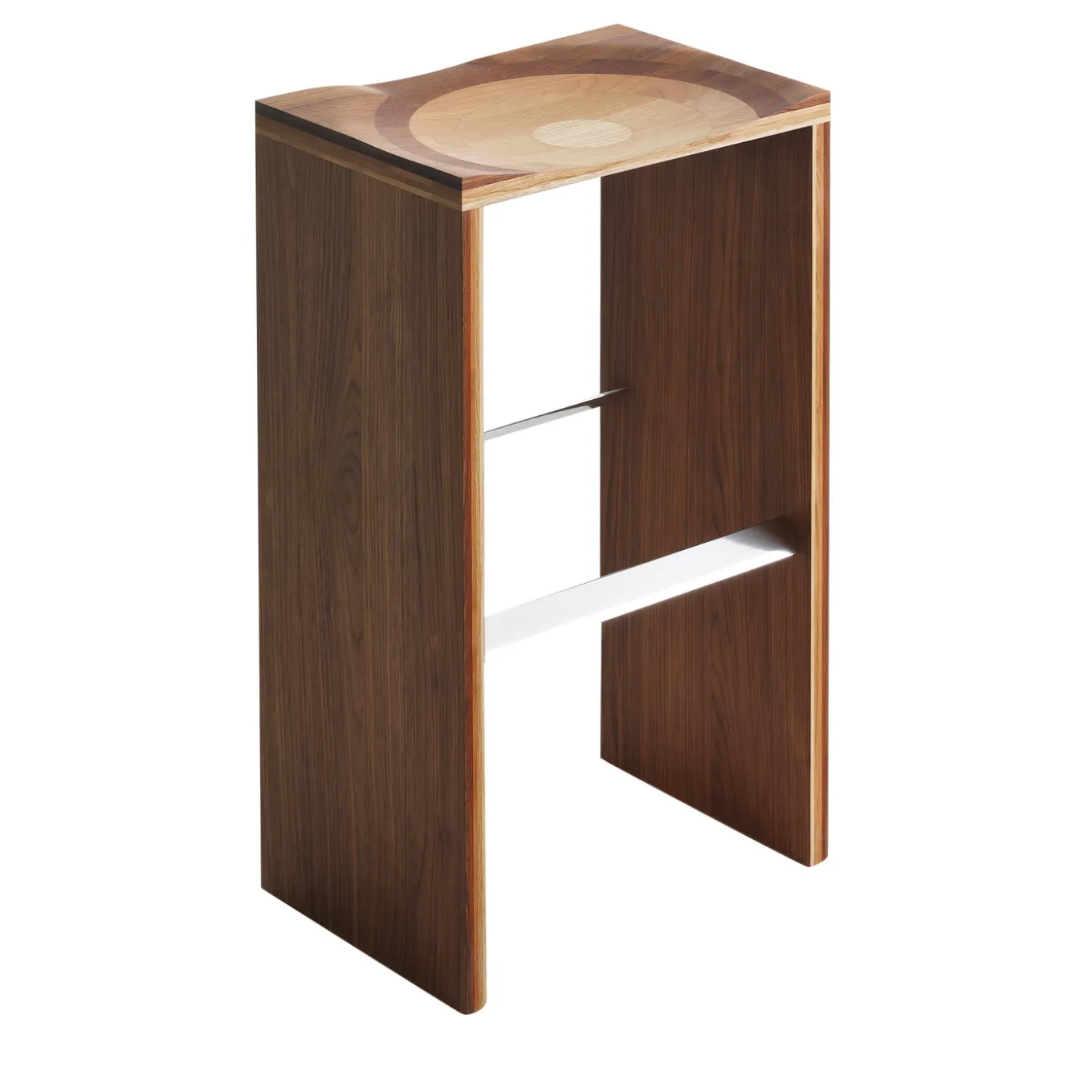 Esempio impeccabile di raffinato artigianato, questo sgabello disegnato da Toyo Ito è realizzato in compensato composto da cinque diversi tipi di legno (noce, mogano, ciliegio, rovere e frassino). La forma della seduta, intagliata con tecnologia industriale ma rifinita interamente a mano, vanta una consistenza morbida dovuta alla duttilità del legno e alla passione di Horm per l’artigianato. I lati di questo pezzo sono dotati di un poggiapiedi in alluminio estruso anodizzato, che completa il design funzionale ed elegante di questo sgabello.