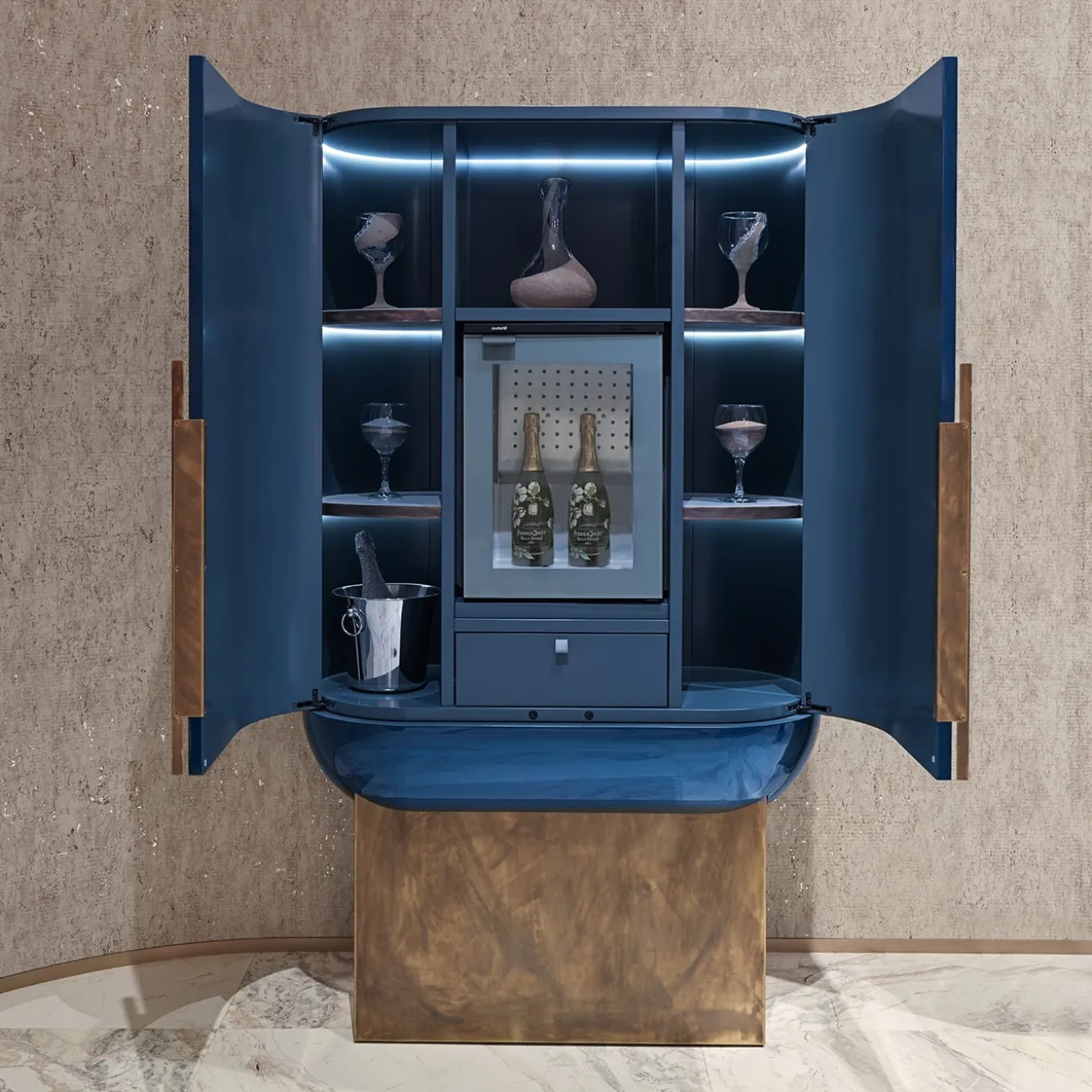 Il mobile bar Siona, disegnato da Matteo Cibit, è realizzato per l’inserimento del frigorifero con una struttura in legno laccato lucido nella sofisticata finitura Blu Notte. L’interno e lo schienale sono in legno laccato opaco in Grigio Ferro, mentre i ripiani imbottiti in Soft Leather Peltro ne esaltano l’eleganza. La base in ottone anticato e l’illuminazione a LED integrata migliorano l’atmosfera, fondendo perfettamente funzionalità e lusso. Perfetto per elevare qualsiasi spazio.