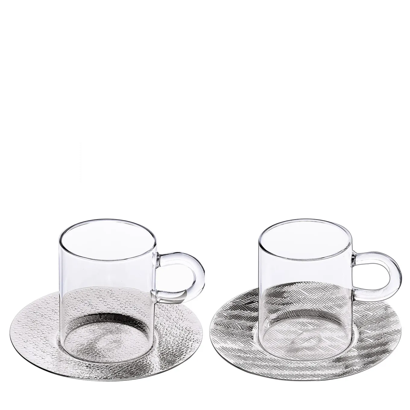 Estetica contemporanea e tradizione artigianale convivono senza sforzo in questo esclusivo set, soluzione ideale per infondere un’inaspettata esclusività a una semplice pausa caffè. Le tazzine da espresso in cristallo, minimaliste e perfettamente trasparenti, poggiano su un set di piattini argentati, impreziositi da diverse texture martellate a mano e ricche di fascino artigianale. Nel catalogo Artemest è disponibile anche una variante dorata.