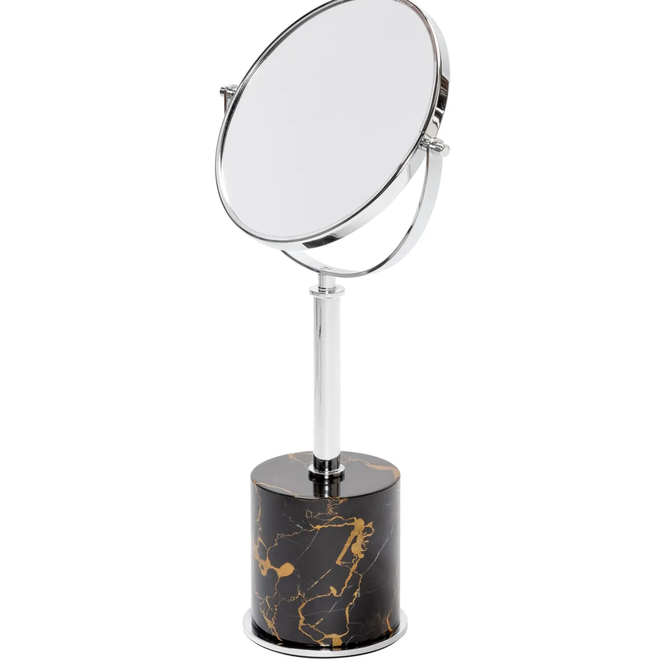 Struttura in metallo disponibile in diverse finiture con una pesante base in marmo che garantisce una perfetta stabilità. Lo specchio ruota a scelta tra ingrandimento 2x e riflessione standard. Finiture di marmo disponibili: Arabescato bianco / verde Guatemala / Eramosa marrone / nero Portoro / Travertino. Finiture metalliche disponibili: cromo / bronzo / ottone.
