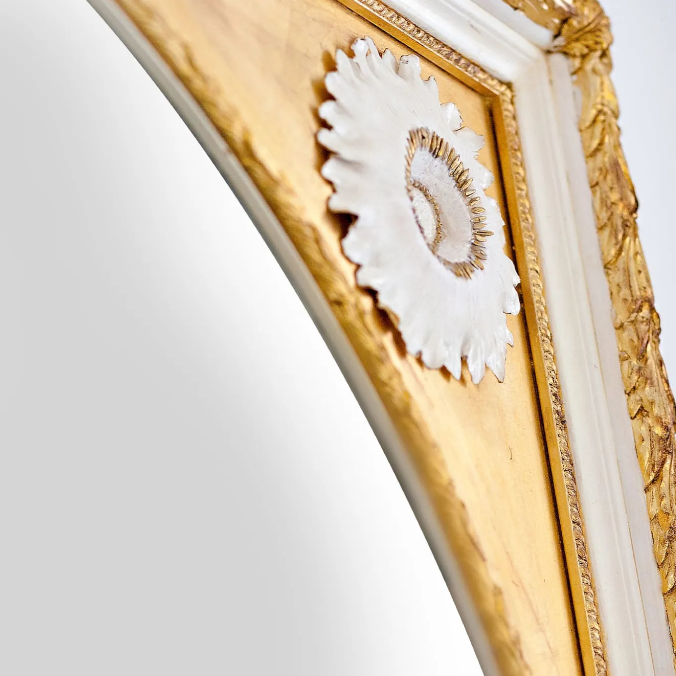 Questo specchio da parete presenta una cornice quadrata in legno dorato, arricchita da laccature bianche, con uno specchio rotondo al centro. Il design è impreziosito da quattro girasoli in porcellana di Capodimonte modellati a mano, posizionati in ciascun angolo e decorati con pistilli dorati a terzo fuoco. Adatto sia ad ambienti classici che contemporanei, questo specchio di medie dimensioni emana un’estetica luminosa e raffinata.
