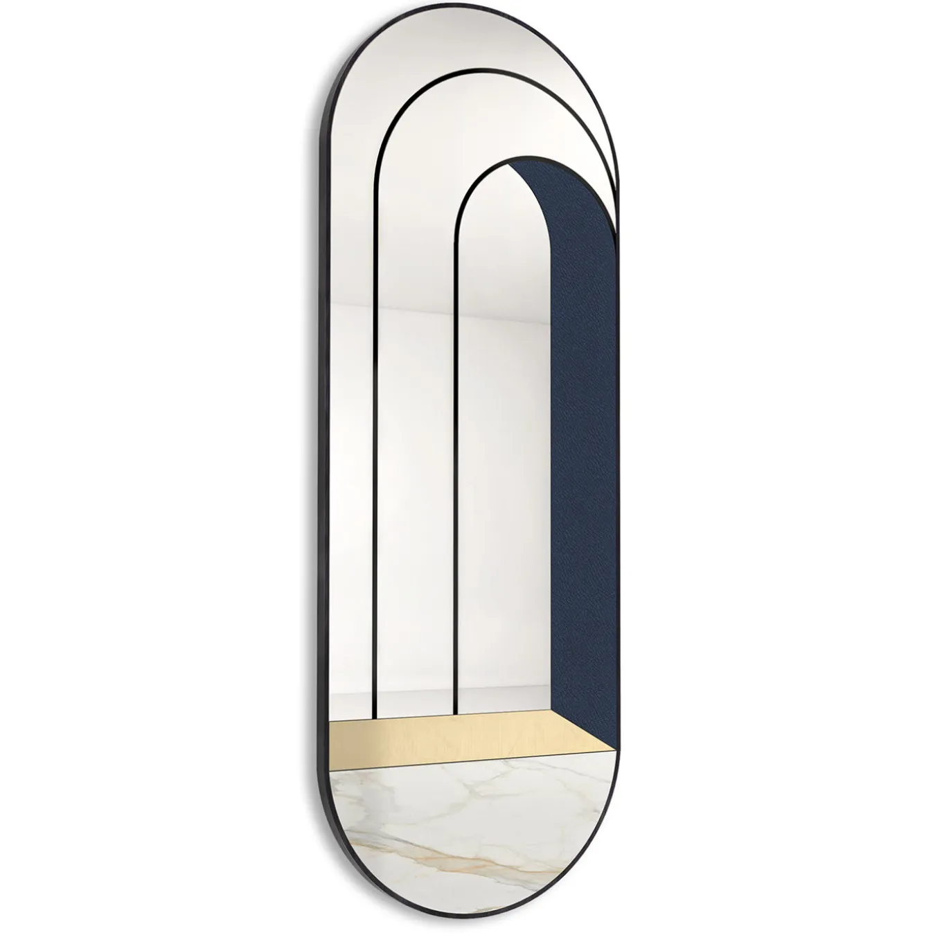 Una porta che conduce a infinite altre. Le geometrie che compongono gli specchi della collezione “Itaca” invitano a un viaggio senza meta, o meglio dove gli incontri, le esperienze e le avventure sono essi stessi la meta. Una lunga galleria di porte che si susseguono ipnoticamente. Parti in vetro specchiato impreziosite da marmo Calacatta, ottone spazzolato e inserti in vera pelle blu.