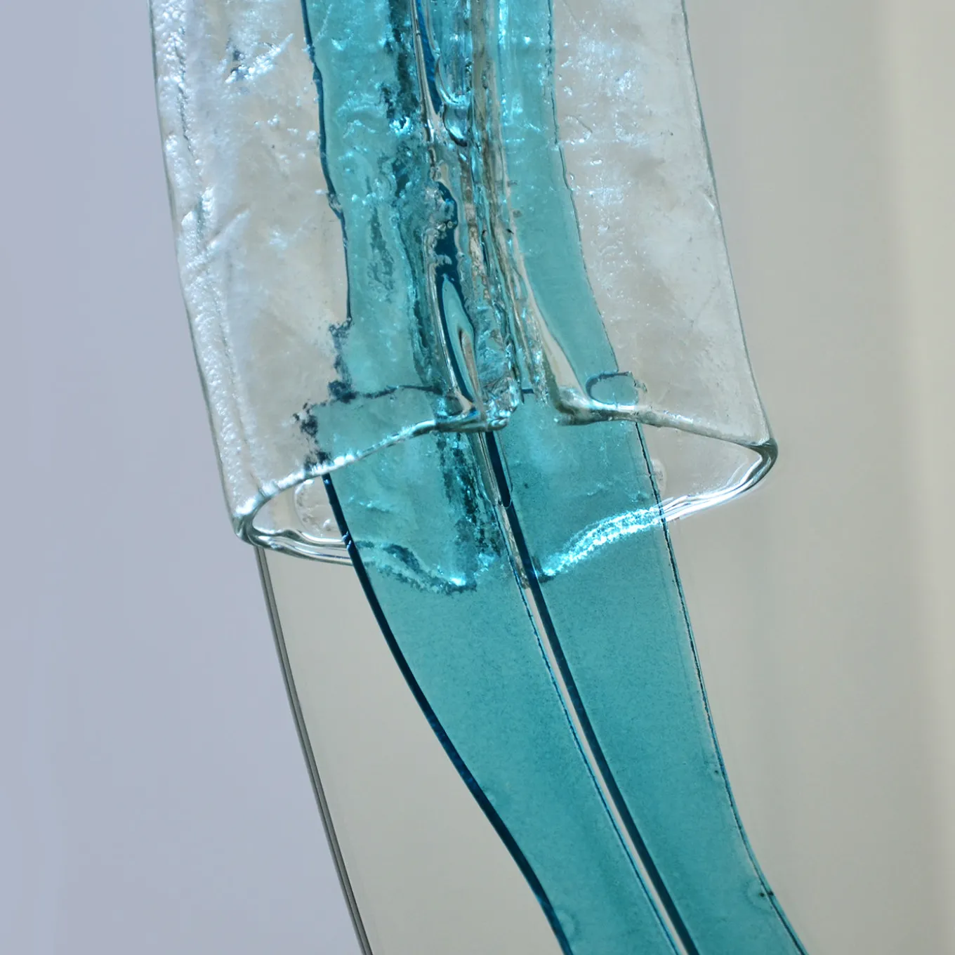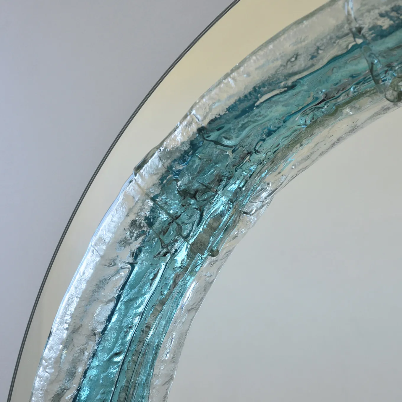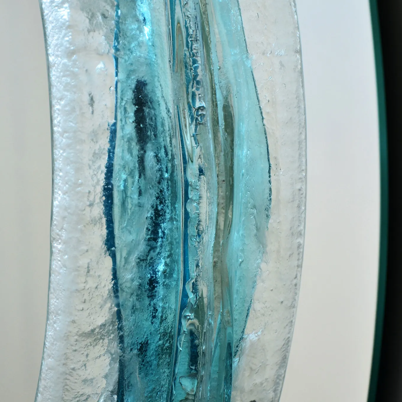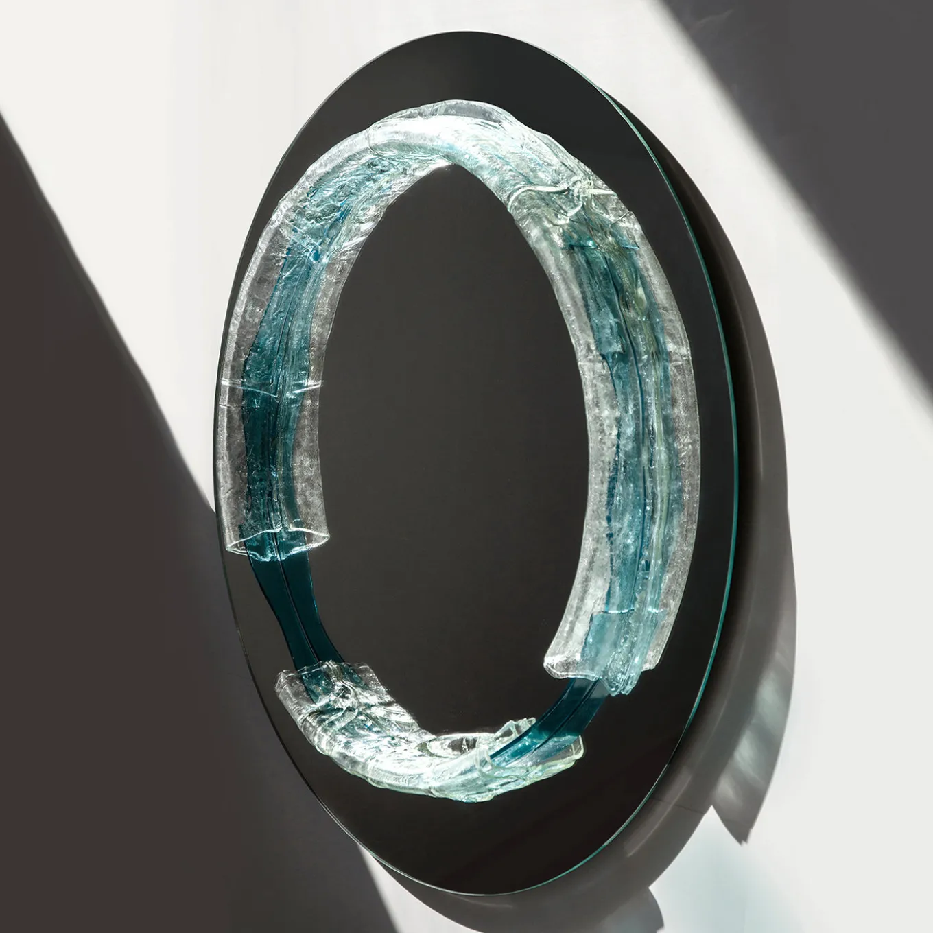Lo specchio rotondo in cristallo Naias ha un diametro di 100 cm e presenta un elemento in vetro acquamarina fluido fuso con cristallo riciclato. Il suo design si ispira al mito delle Naiadi, evocando il movimento e la vitalità delle sorgenti fluenti. Le morbide curve dello specchio e i materiali trasparenti creano un effetto vibrante e pulsante, combinando una ricerca estetica innovativa con un’artigianato sostenibile.