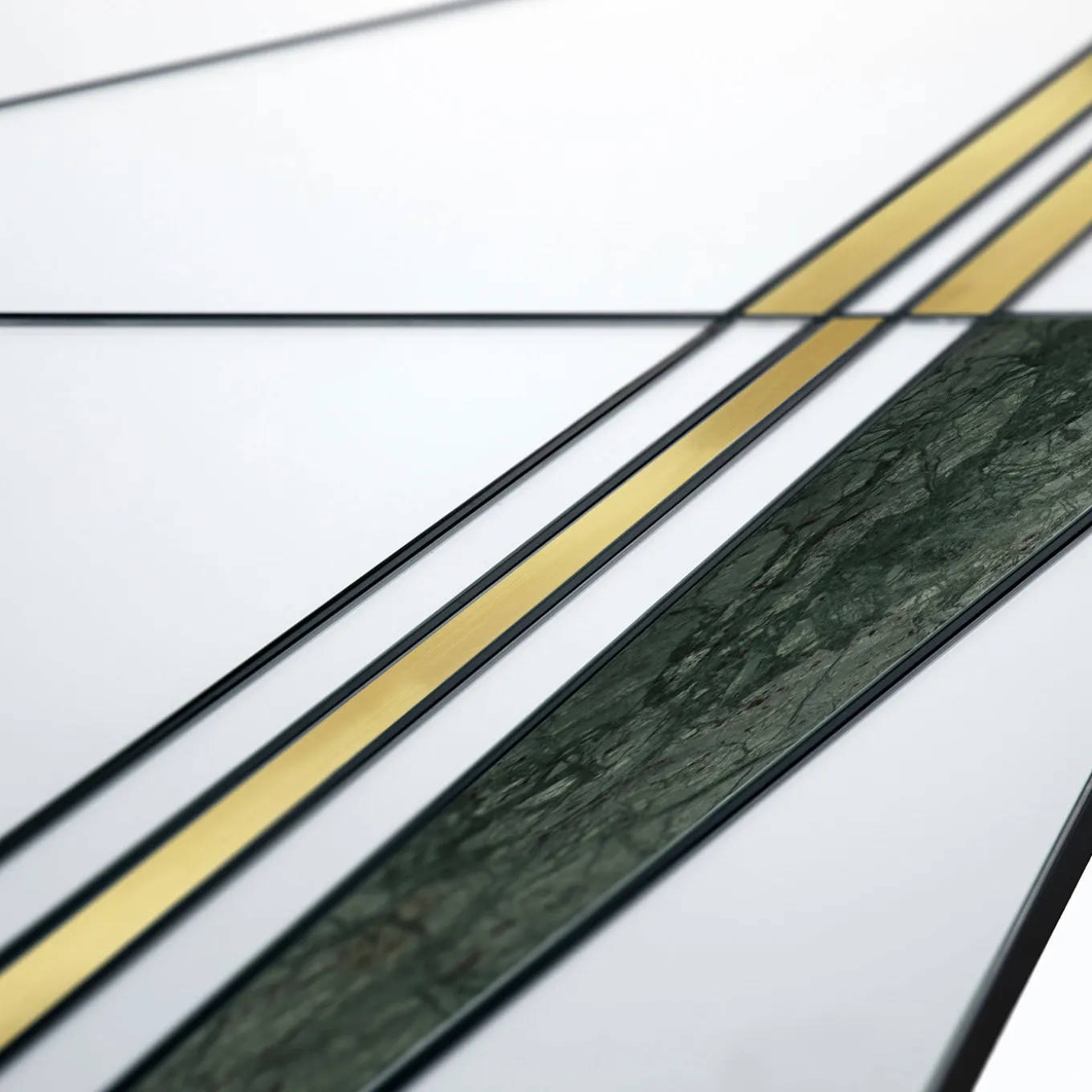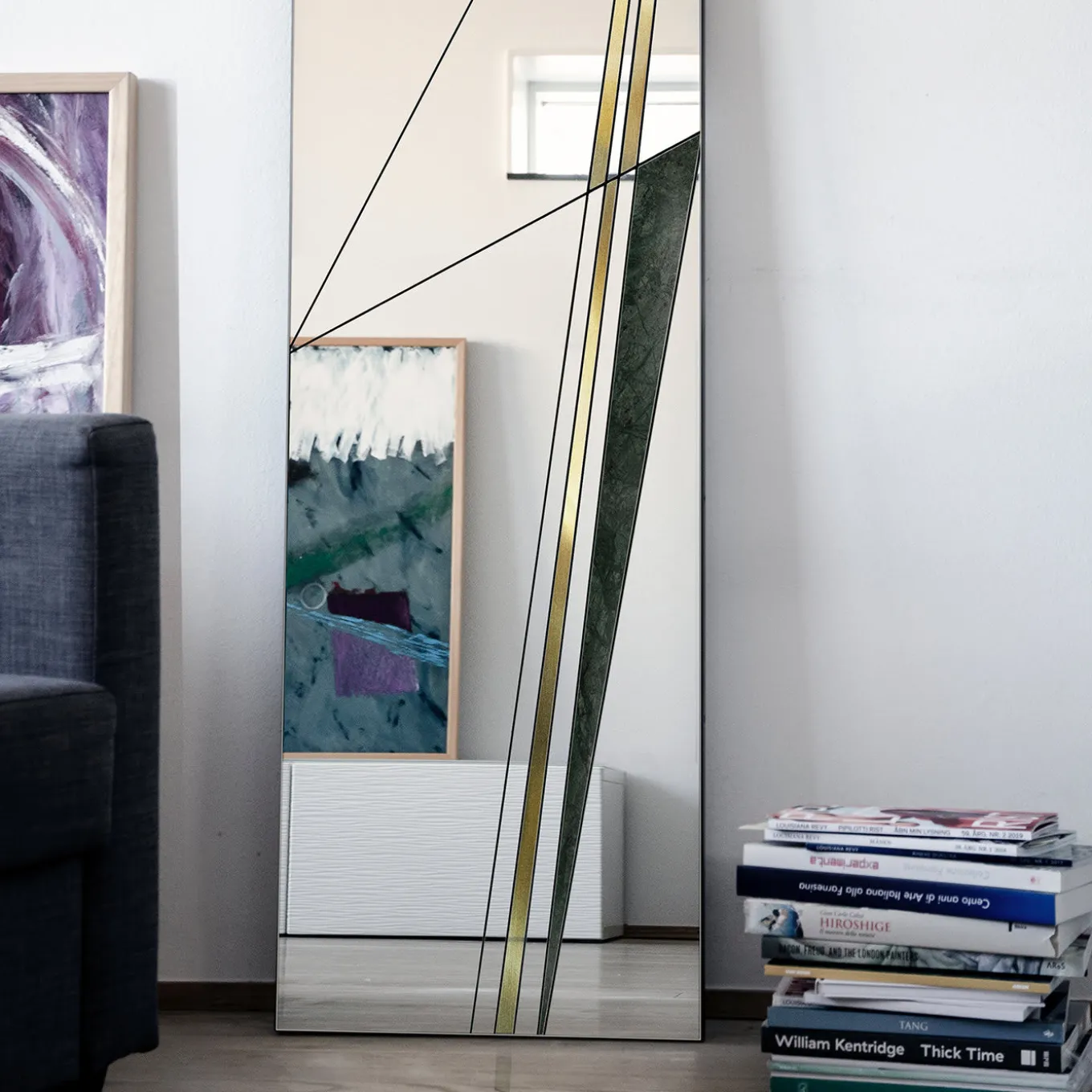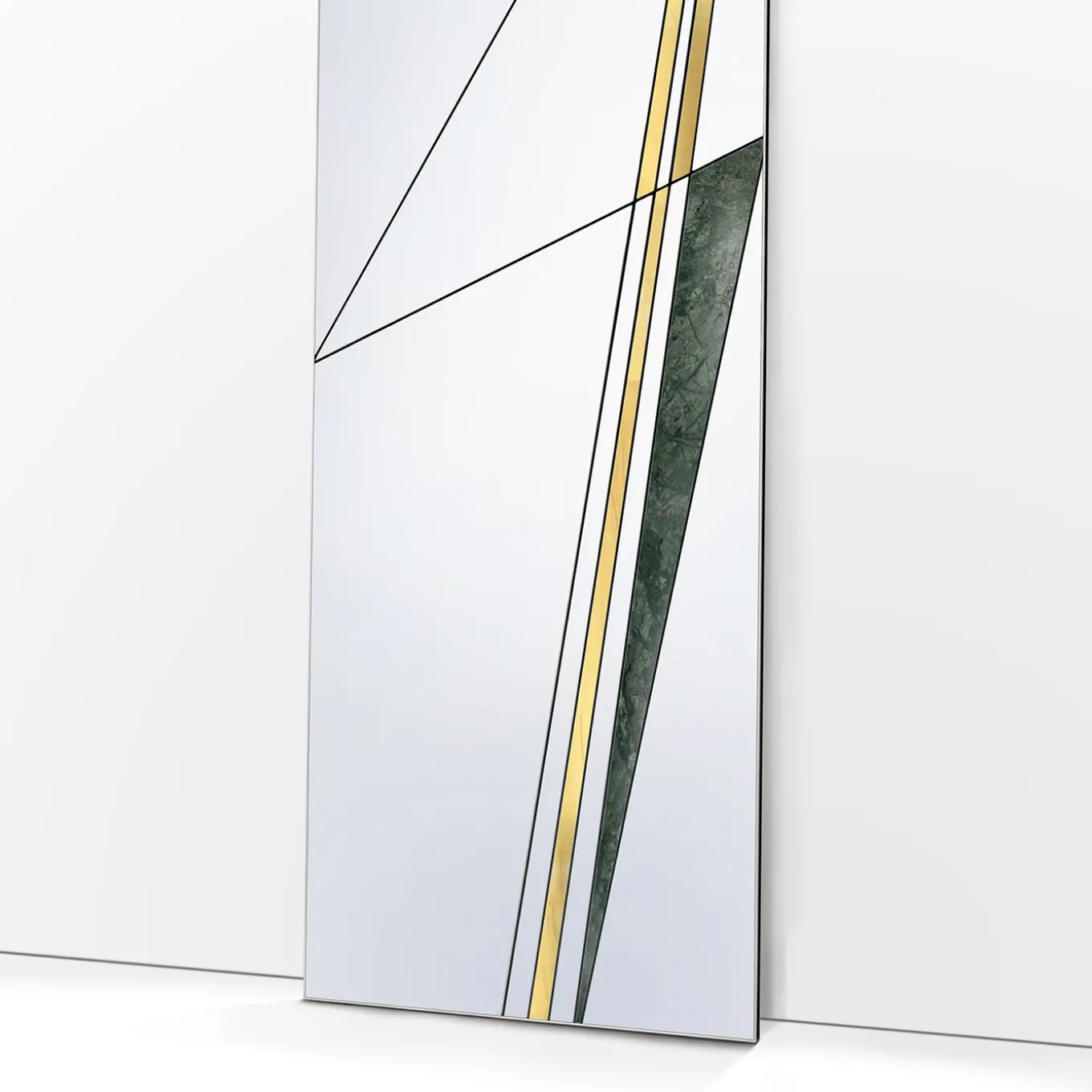 Questo splendido specchio da terra è un’interpretazione astratta della rete stradale dell’epoca romana. Realizzato interamente a mano, sarà un’aggiunta sontuosa a un interno contemporaneo, appoggiato a una parete dell’ingresso, della camera da letto o del soggiorno. La sua silhouette rettangolare ha una base in legno arricchita da una serie di elementi in vetro specchiato con finiture in alluminio. Piccoli inserti in ottone spazzolato e marmo verde del Guatemala aggiungono un tocco di colore e una decorazione intrigante.