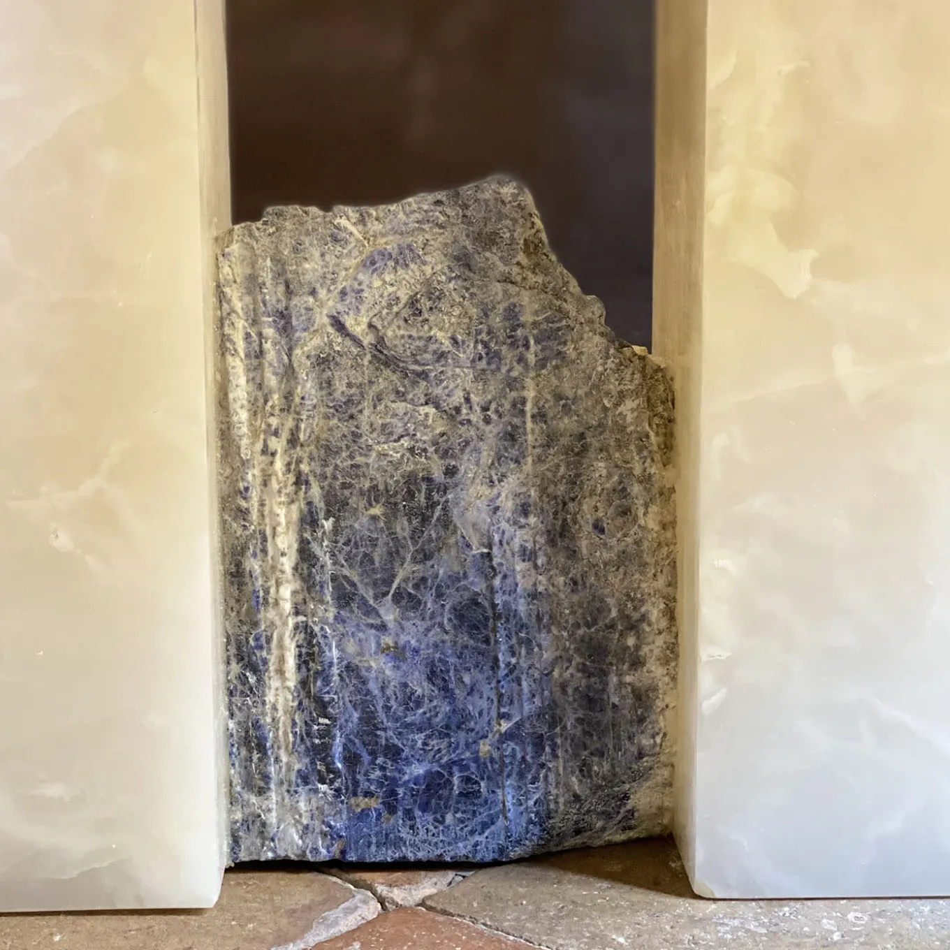 Questo elegante tavolo d’accento in marmo, con piano perfettamente irregolare e base solida, è stato sviluppato fondendo il marmo Honey Onyx con la Sodalite. Combina linee eleganti e armoniose e una pietra di marmo scultorea elegantemente accostata ai solidi ritagli di marmo del piano e dei lati. Una scultura funzionale che gioca con la geometria, l’equilibrio e la natura per elevare l’aspetto di qualsiasi spazio abitativo contemporaneo. Questo pezzo è unico.
