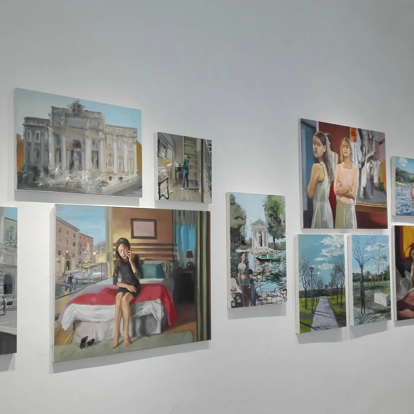Una stanza d’albergo a Roma, suggerita dalla vista di una piazza romana con una fontana sullo sfondo, definisce questo dipinto a olio su cotone, dove una donna in abito nero appare assorta in una telefonata. Le pennellate decise e l’uso audace dei colori sono una caratteristica peculiare dello stile di Federico Lombardo, che conferisce a ogni elemento l’attenzione che merita. Il dipinto è montato su supporto in legno.