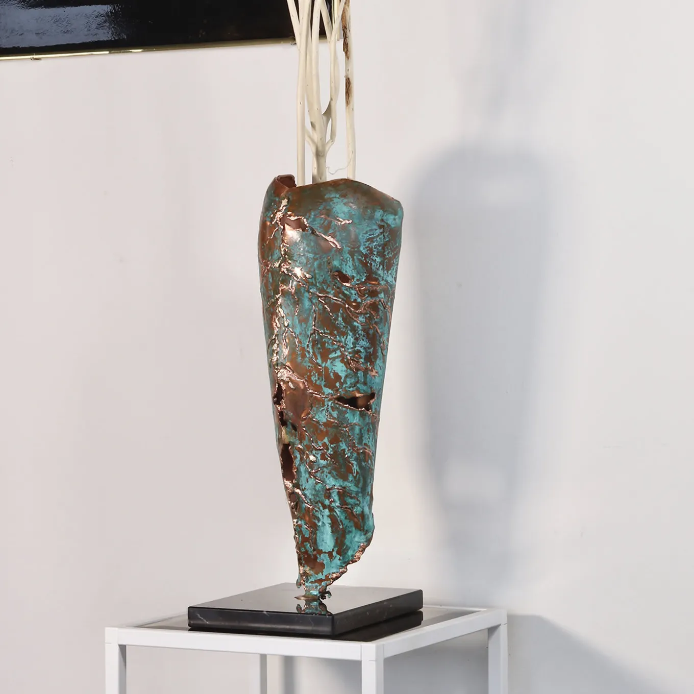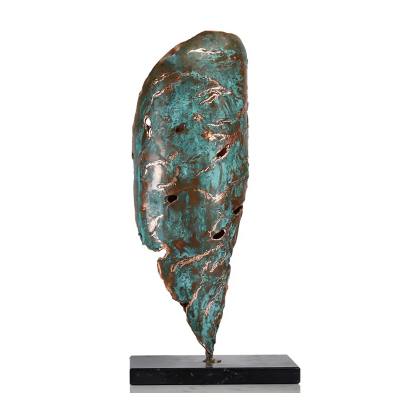 Un nuovo germoglio fa capolino da sotto un mucchio di foglie cadute. Il ciclo vitale della natura continua, in tutti i suoi magnifici colori. Questa statua è realizzata in rame riciclato, lavorato a mano e completato con trattamenti naturali per esaltare la tonalità verde. Un pezzo sostenibile, realizzato interamente a mano.