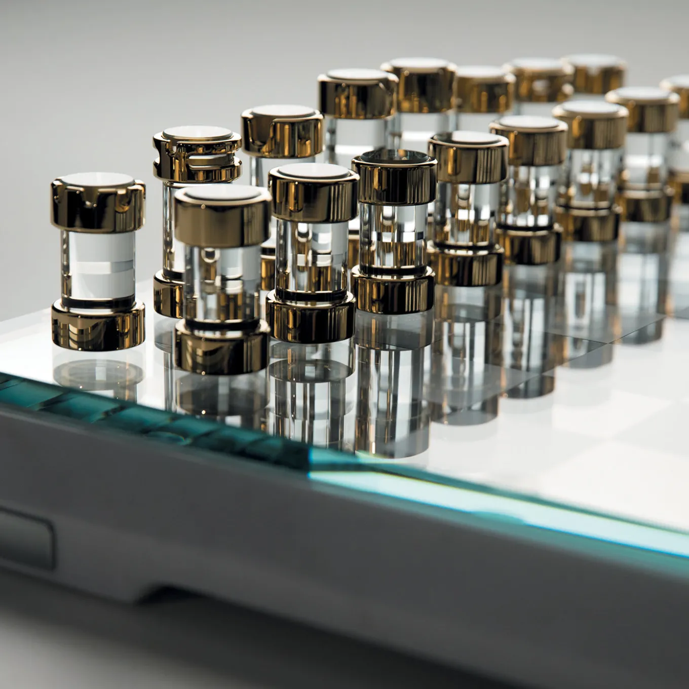 Un’interpretazione contemporanea del gioco iconico degli scacchi, questa scacchiera è un oggetto decorativo sublime che delizierà generazioni di giocatori, aggiungendo anche un accento sofisticato a un interno moderno o industriale. La superficie a scacchi della scacchiera è coperta in cristallo extra-chiaro e poggia su una base in marmo Marquina (disponibile anche in marmo bianco Carrara e legno). I pezzi minimalisti sono torniti in cristallo extra-chiaro con dettagli in ottone. Il costo del pezzo varia a seconda dei giochi. Elenco dei giochi disponibili: scacchi, dama, backgammon, scacchi cinesi e ludo. Un lato ha dettagli in ottone placcato in oro 24k, l’altro ha dettagli in ottone cromato.
