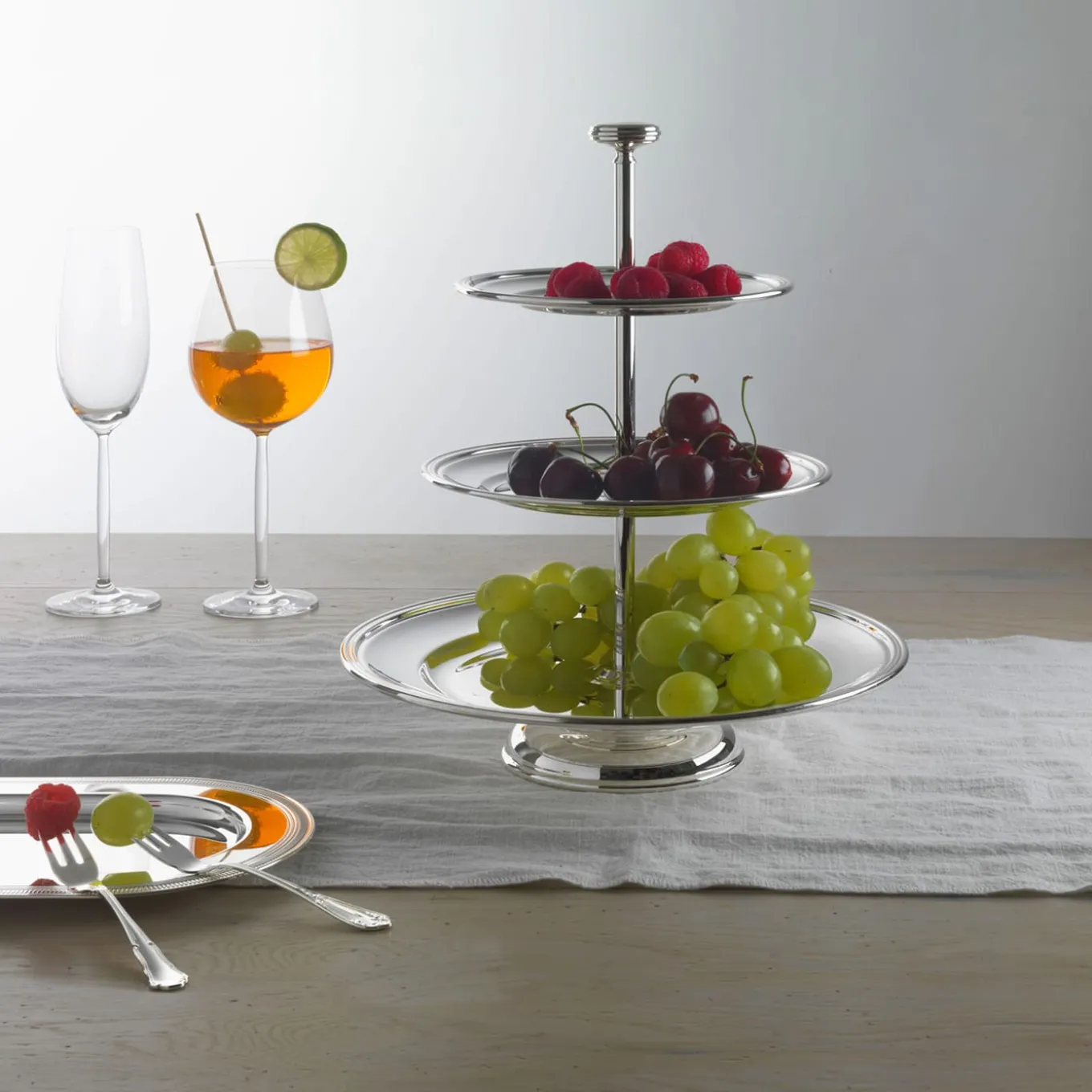 Ideale per esporre qualsiasi cosa, dalla frutta ai cupcake, questo supporto presenta un design elegante e senza tempo con una placcatura in argento lucido. Vanta tre livelli di diametro variabile, che offrono una disposizione perfetta per organizzare gli alimenti. La base circolare con piedini assicura un supporto strutturale eccezionale, mentre il pomello superiore aggiunge praticità per una facile manipolazione. I piatti misurano 27 cm, 19,5 cm e 15 cm e rappresentano un’aggiunta elegante e funzionale a qualsiasi riunione o esposizione.