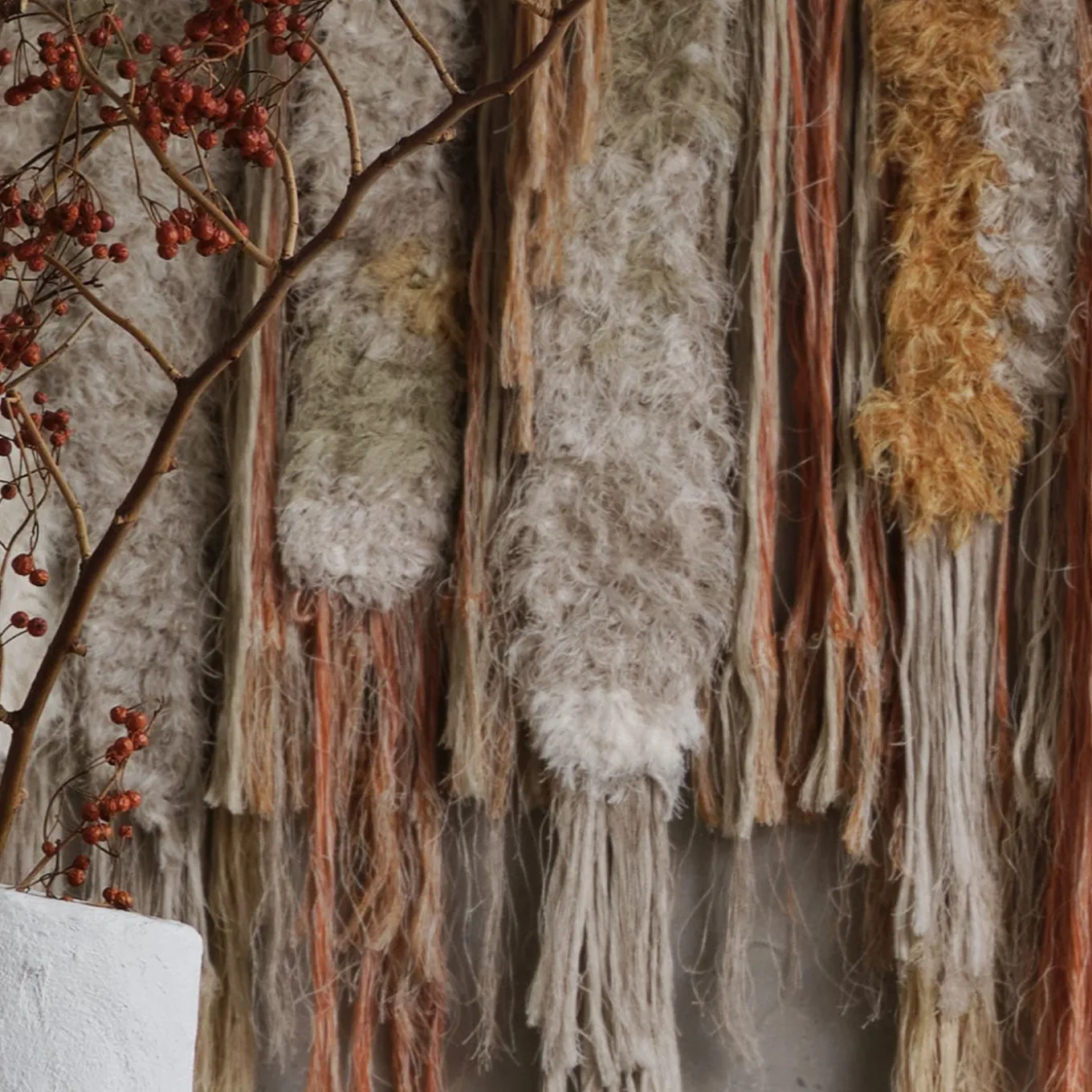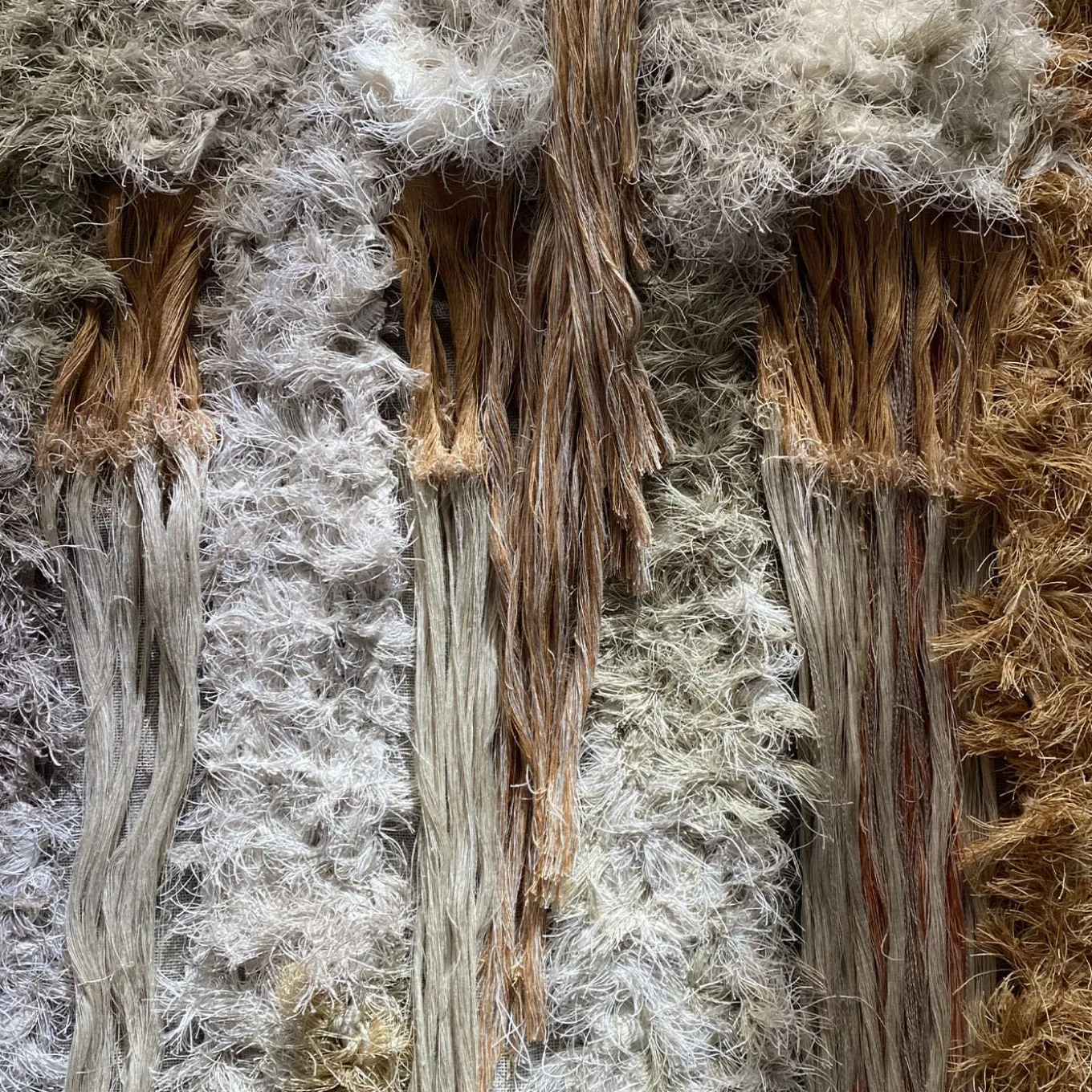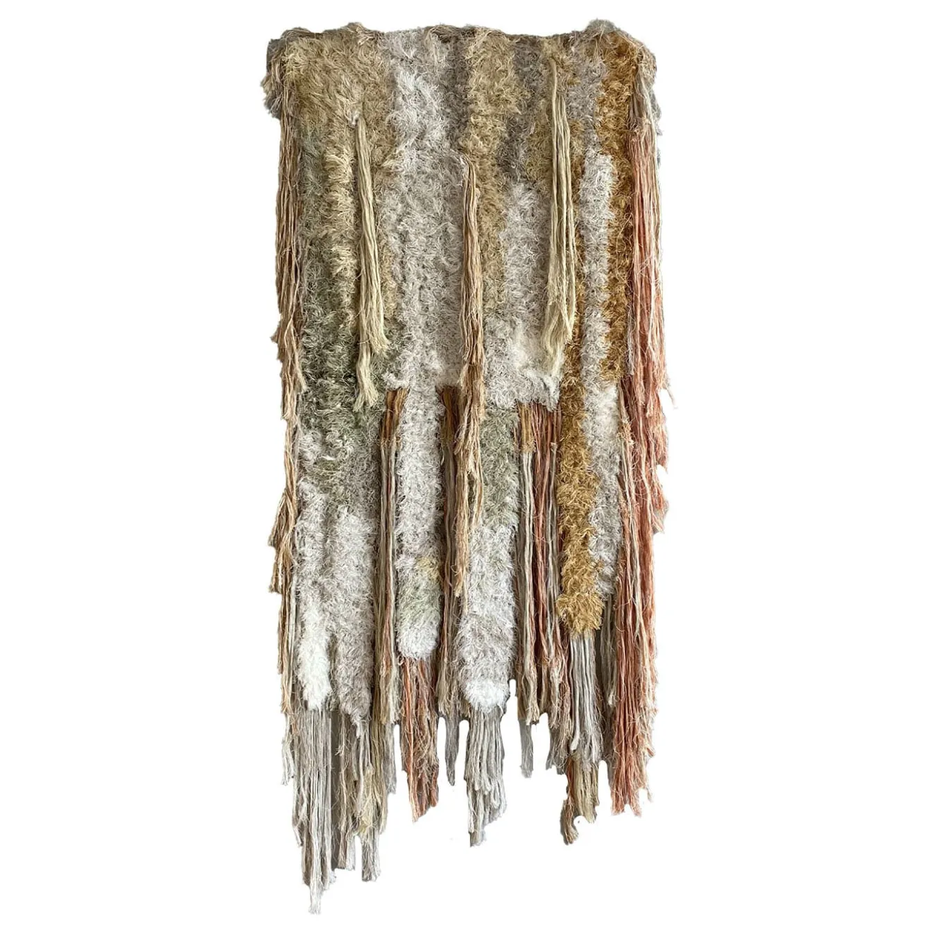 Questo singolare arazzo è realizzato con fili e tessuti di recupero Made in Italy nell’ambito della collezione Noloom (in riferimento al processo di produzione che non utilizza telai). I fili di colore giallo, arancione, bianco e marrone chiaro si intrecciano delicatamente, mentre le note di verde ne suggellano il carattere giocoso. Presentato alla Galleria Paola Colombari nel 2022 e alla Milano Design Week 2023. Dotato di una fessura per inserire un’asta da appendere, non inclusa nell’acquisto.