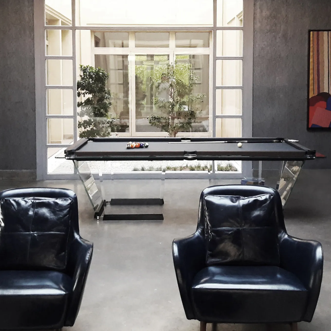 Un prezioso set da biliardo perfetto per un centro giochi domestico, questo superbo tavolo da biliardo trasmette leggerezza visiva nonostante il suo design imponente. Il piano temperato e le gambe affusolate, realizzate con lastre di cristallo dello spessore di 1,5 cm, poggiano su basi quadrate in acciaio inox lucidato con elementi in durmast con finitura in bronzo chiaro. I cuscini in alluminio anodizzato nero fanno da contorno al tappeto da gioco in tessuto nero (disponibile in 25 varianti di colore) con cinghie tascabili in poliuretano. Il certificato di autenticità e il pacchetto di istruzioni sono inclusi nell’acquisto.