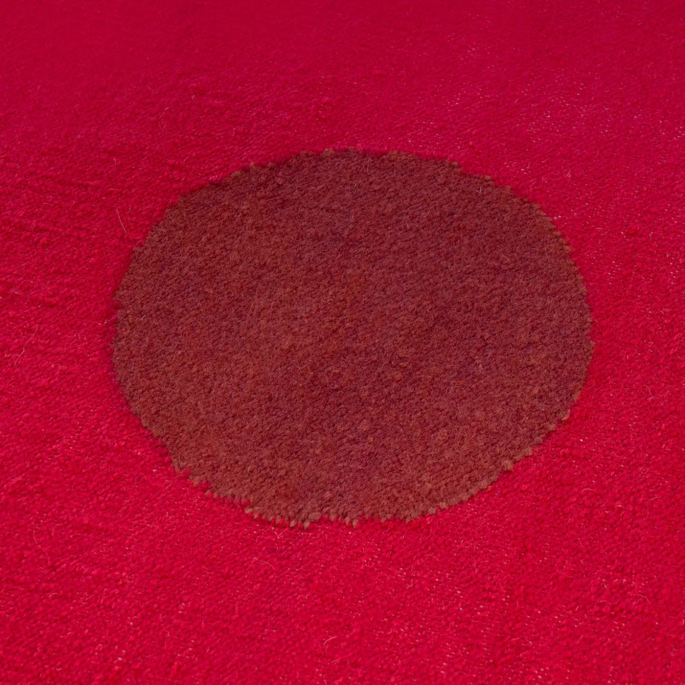 Il tappeto Kilim di Stefania Ruggiero presenta un campo rosso profondo centrato da un cerchio più scuro, evocando il potere simbolico del fuoco e uno sguardo concentrato e meditativo. Il design minimale e ipnotico trasmette temi di solitudine e connessione, conferendo calore e profondità emotiva a qualsiasi ambiente. Un pezzo che arricchisce gli interni con presenza estetica e forza narrativa, trasformando lo spazio in un luogo di riflessione e atmosfera.