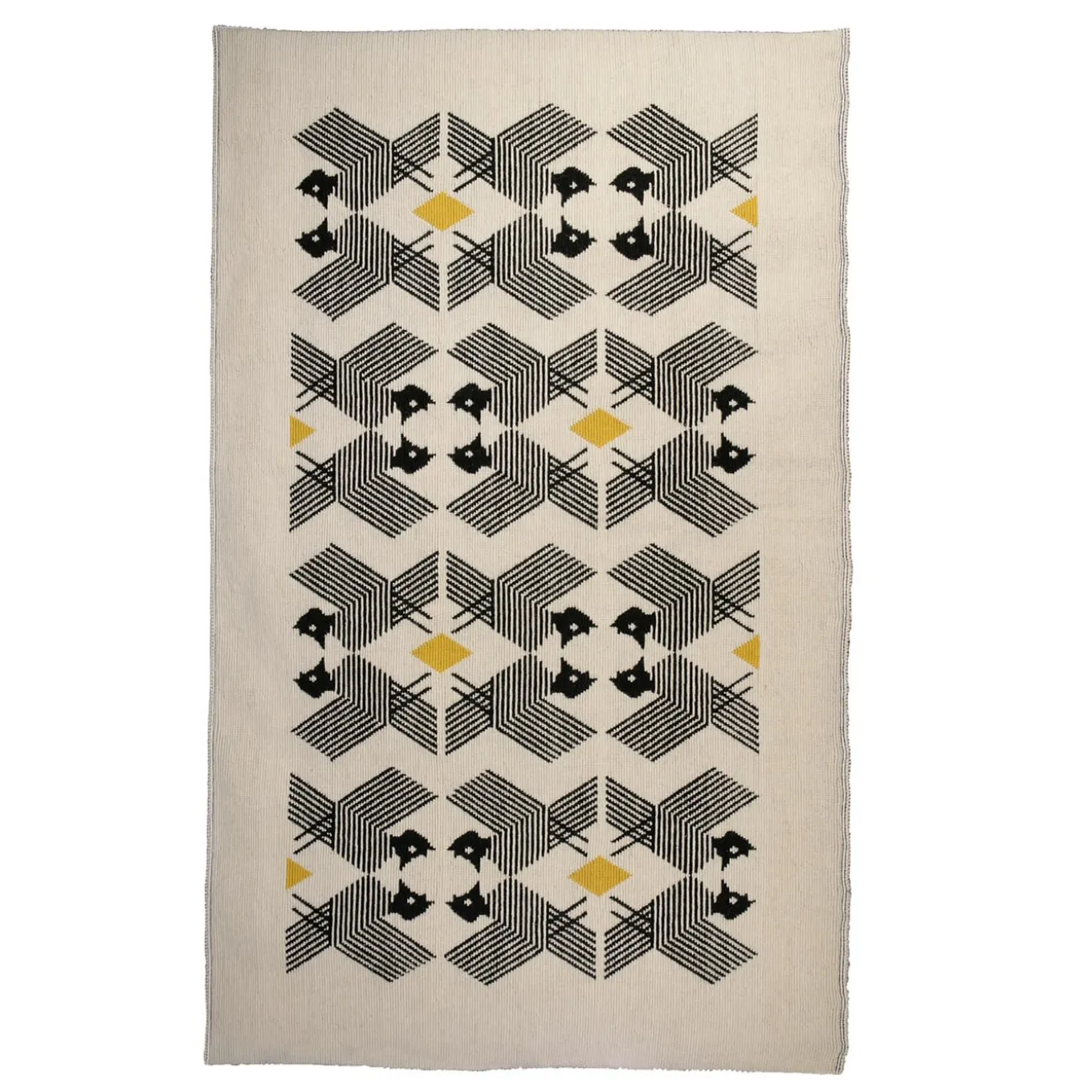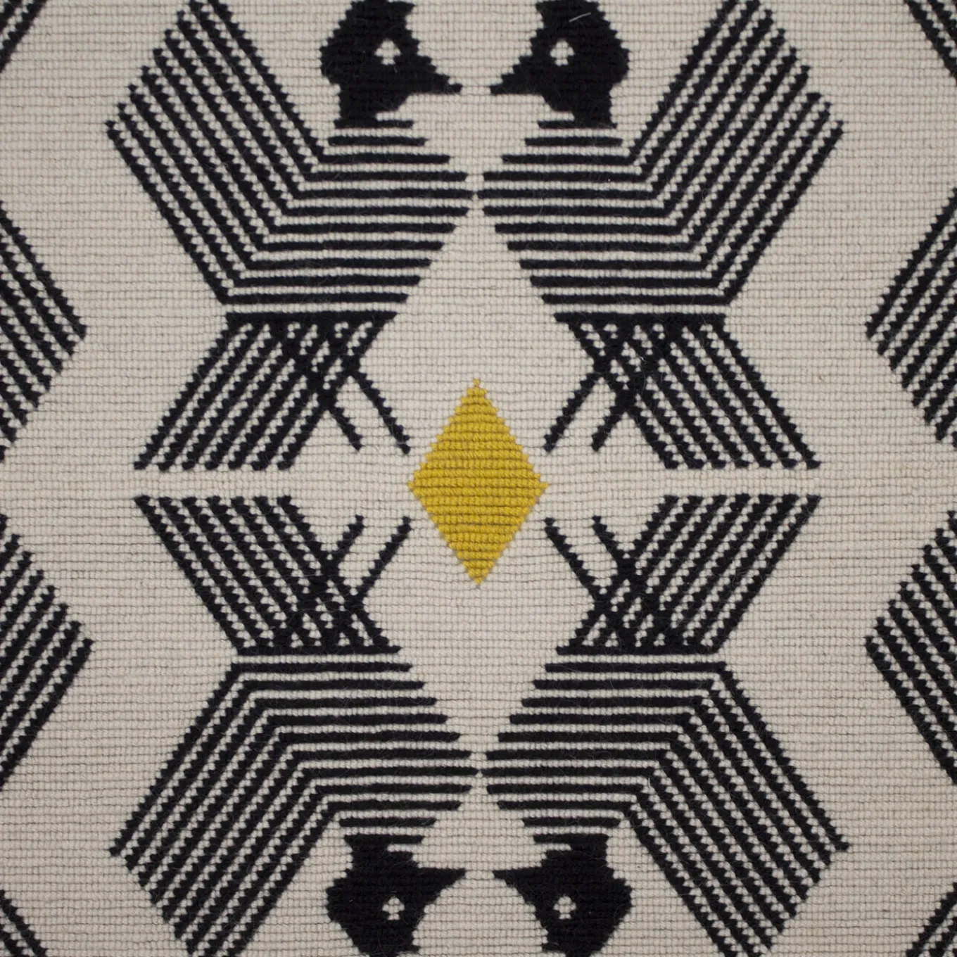 Maestria nella tessitura e riferimenti mitologici si fondono in questo tappeto unico disegnato da Maurizio Demelas. Realizzato seguendo l’antica tecnica sarda dei “pipiones”, il disegno nero di grifoni stilizzati – simboli araldici e chimerici di custodia – è punteggiato da rombi gialli ed emerge da uno sfondo beige brillante. Il disegno trasmette un senso di potenza e ferocia.