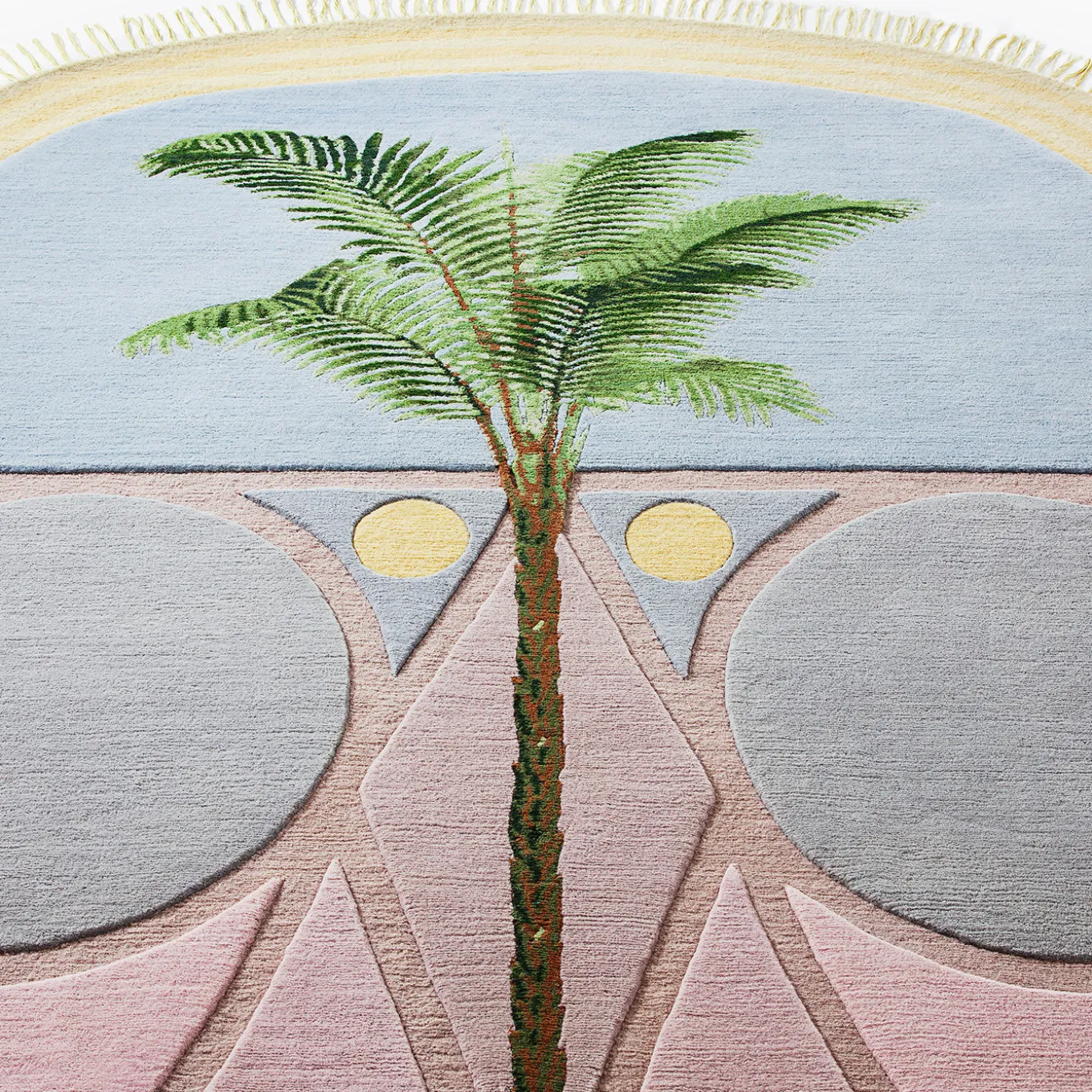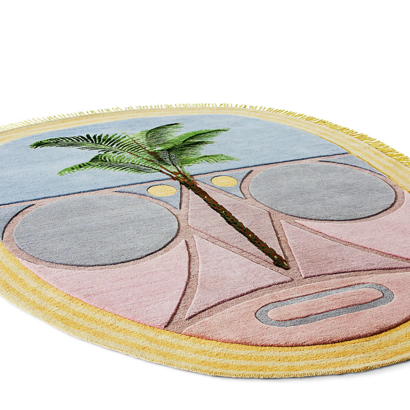 Questo eclettico tappeto in lana, disegnato da Formafantasma nel 2014, rompe i canoni del design nella produzione di tappeti. Il profilo a forma di uovo presenta un’immagine antropomorfa con due cerchi per gli occhi, una bocca ovale oblunga, triangoli lungo la bocca, una palma realistica che si estende per tutta la lunghezza del naso e frange lungo la metà superiore per simulare i capelli. Annodato a mano in Nepal, questo tappeto esclusivo fa parte di un’edizione limitata a 10 pezzi e presenta 150 nodi per pollice con un’altezza del pelo variabile di 4/6/8/10 mm. Dimensioni personalizzabili su richiesta.