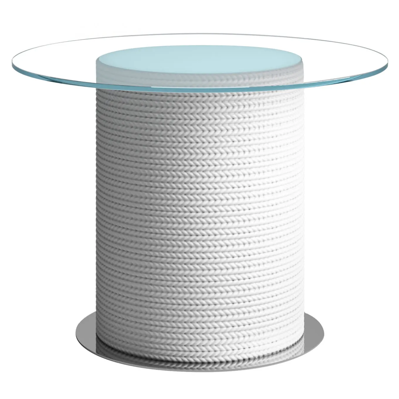 Un pezzo che riecheggia un raffinato stile nautico, questo tavolo rotondo è un esercizio di linee geometriche che eleverà qualsiasi terrazza moderna, patio o zona piscina, offrendo una soluzione per pranzare o prendere un aperitivo in tutta tranquillità. Il piano circolare in vetro extrachiaro è parzialmente retroverniciato e poggia su un’audace colonna rivestita in PLA (poliuretano) bianco che scende fino a una base a disco in acciaio inossidabile.