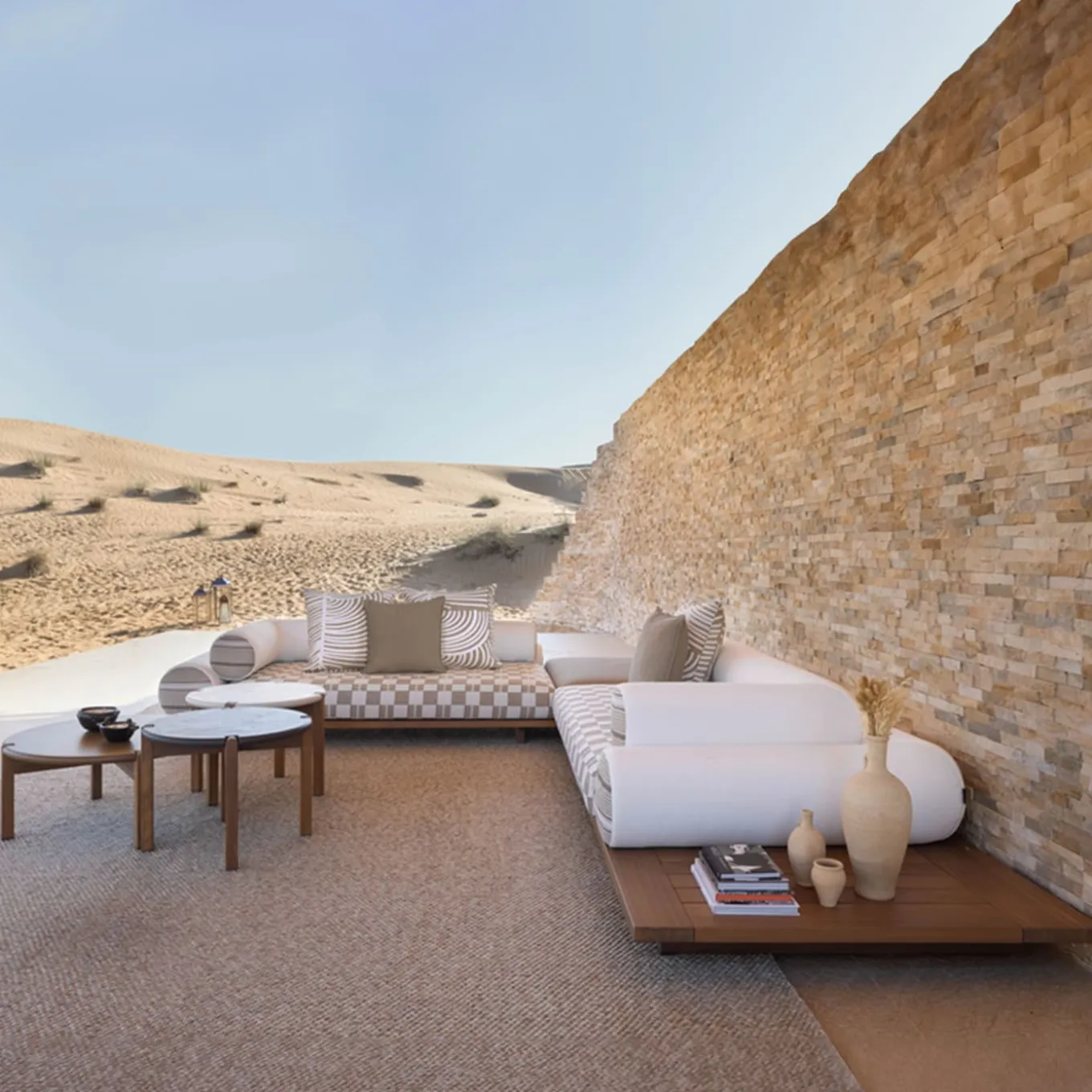 Amar (Luna in arabo) è un tavolino da caffè per esterni dalla forma essenziale e dall’aspetto solido che ricorda lo stile di vita nomade. Le gambe in legno di iroko sostengono un piano rotondo in compensato marino di Okumè con un effetto tattile e strutturato. La superficie è realizzata con polimeri a base d’acqua, olio di girasole, inerti naturali e materiali di scarto recuperati, applicati a mano da artigiani specializzati, creando ogni giorno un prodotto unico. Il prezzo include la copertura protettiva.