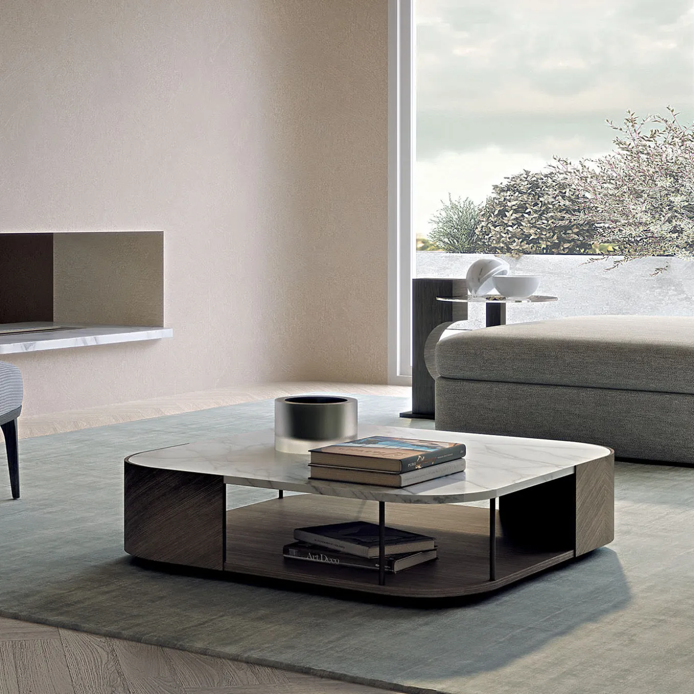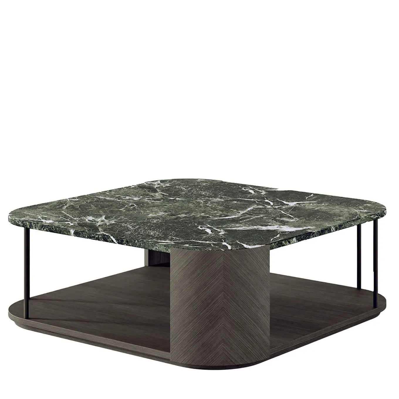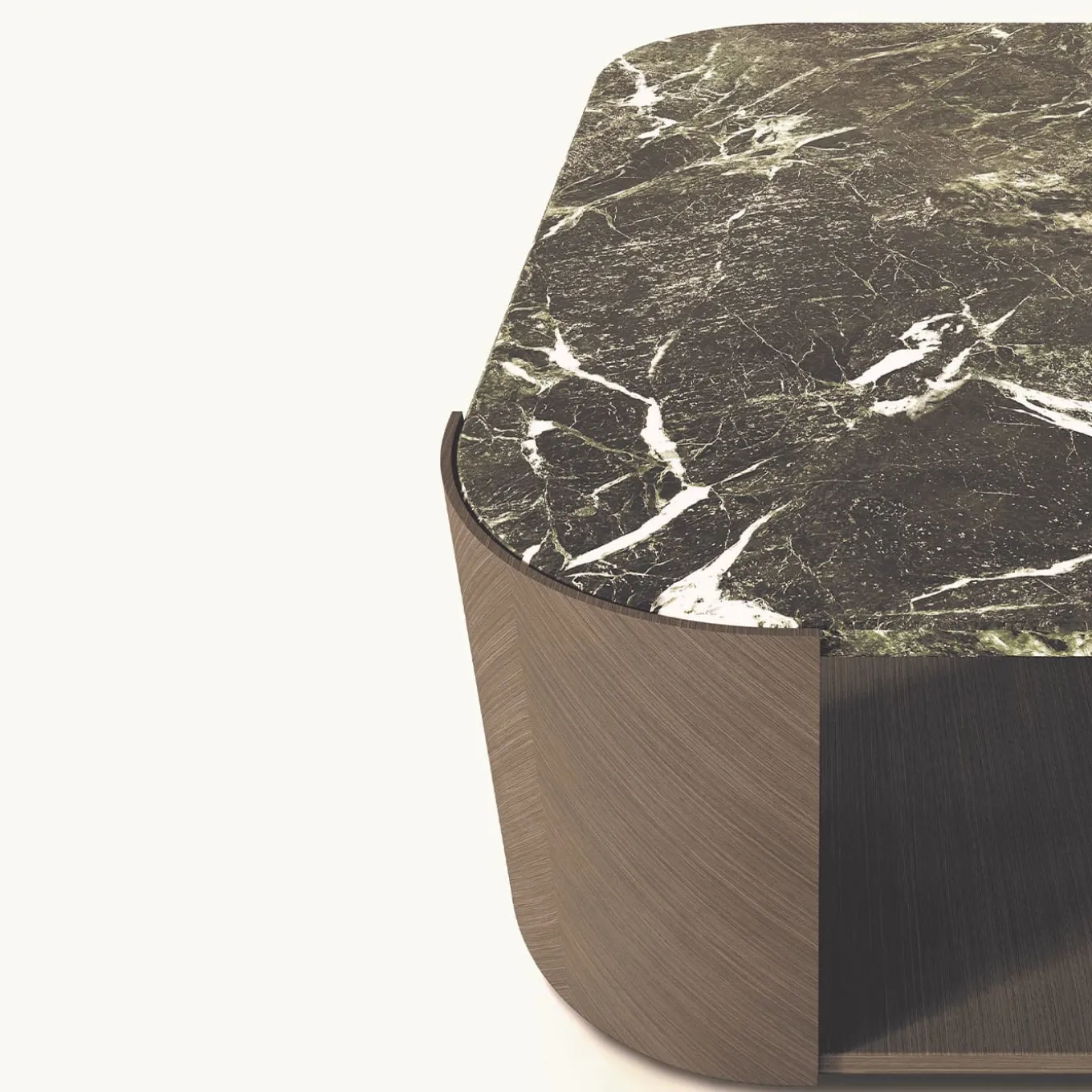 Tavolino ispirato alla libreria Gae. Gli elementi curvi sono in Tay scuro con piano in marmo verde Lepanto opaco. I supporti metallici sono in finitura bronzo-oro.