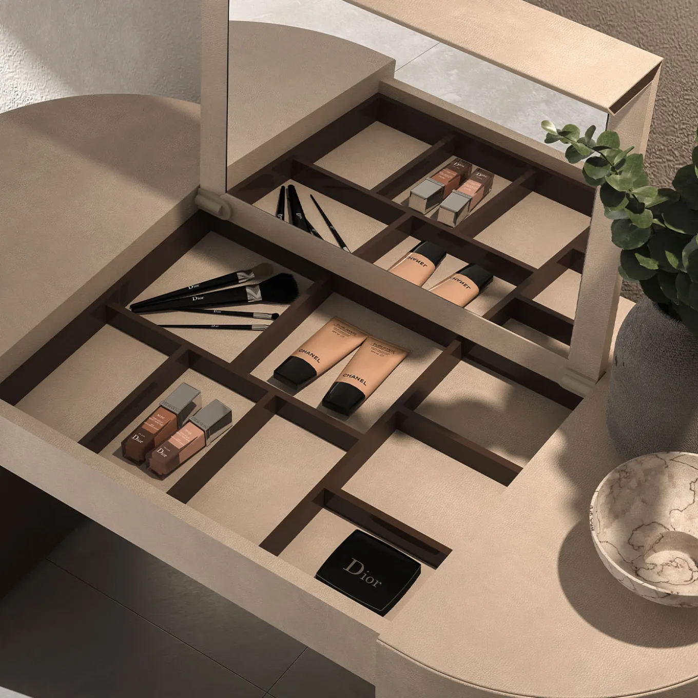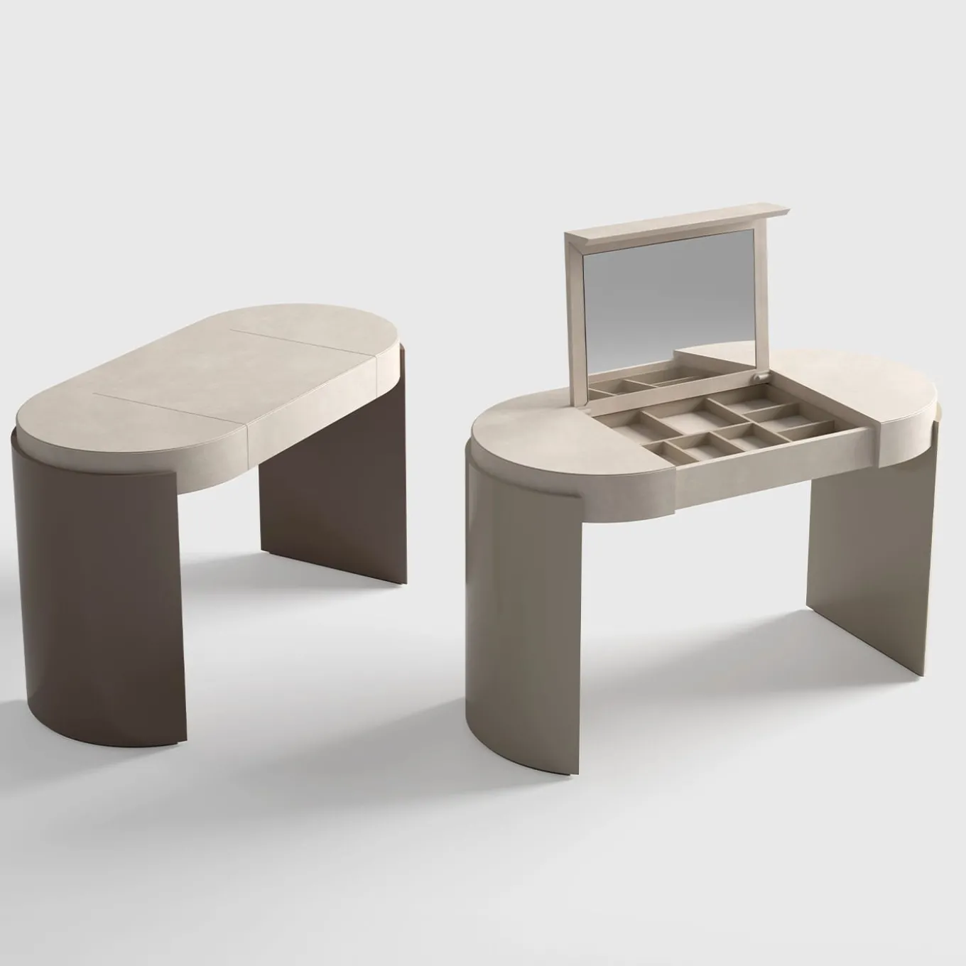 Scoprite l’eleganza con il tavolino da toilette. Dotato di un lussuoso piano in pelle, dona un tocco di raffinatezza allo spazio. Le gambe laccate lucide (RAL 1019) conferiscono un aspetto elegante e moderno, mentre i dettagli in metallo spazzolato aggiungono una finitura raffinata. Il tavolo da toilette combina perfettamente materiali pregiati e design contemporaneo, rendendolo un’aggiunta a qualsiasi stanza.