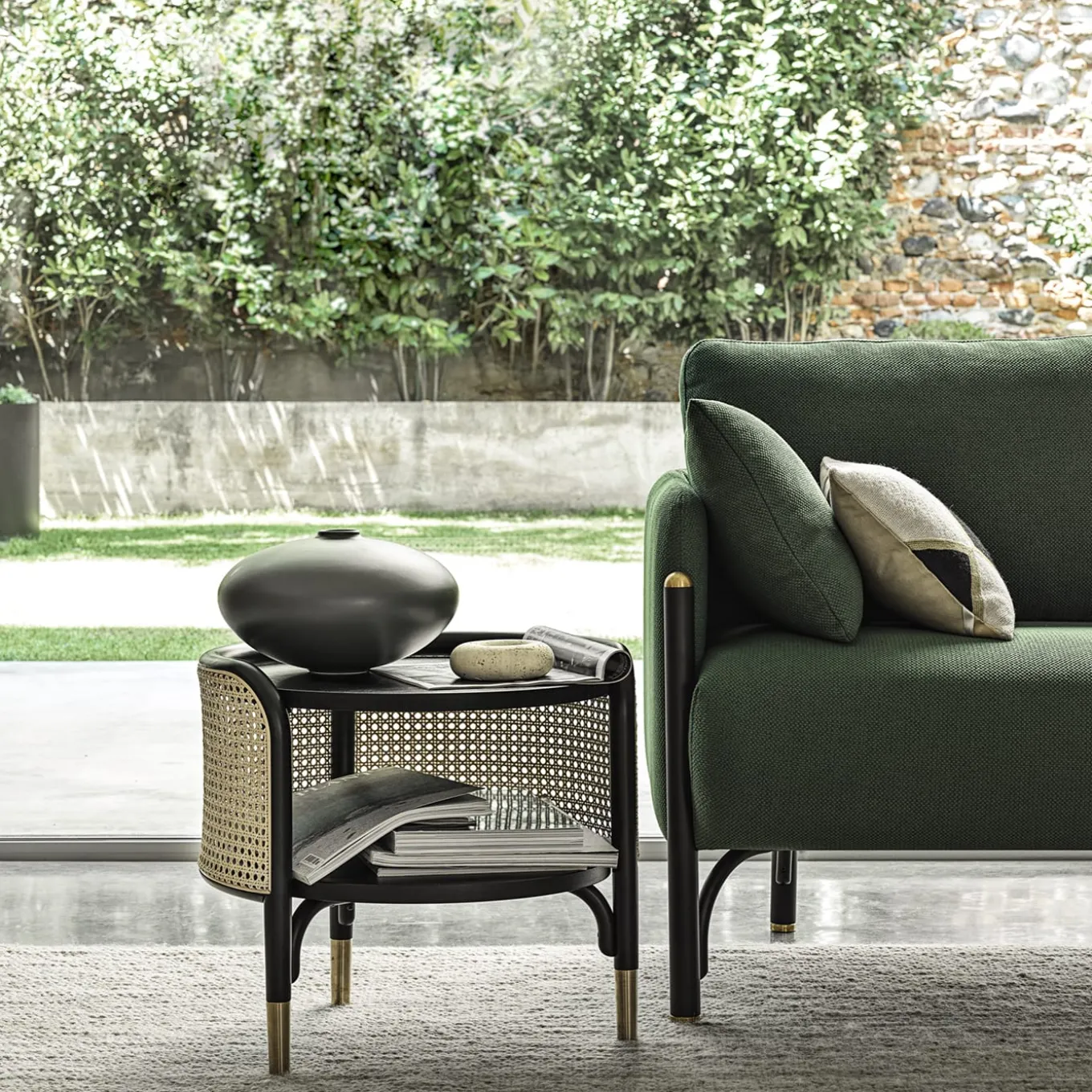 Disegnato dal duo di architetti GamFratesi, questo splendido tavolino fa parte di una serie di oggetti d’arredo raffinati e moderni che comprende anche una consolle, un mobile e una libreria. Utilizzabile come tavolino da salotto o comodino, il suo design arioso ed elegante è realizzato artigianalmente in legno di faggio curvato e laccato nero e paglia di Vienna. L’intero pezzo poggia su piedini in ottone. Disponibile in finitura naturale su richiesta al Concierge.