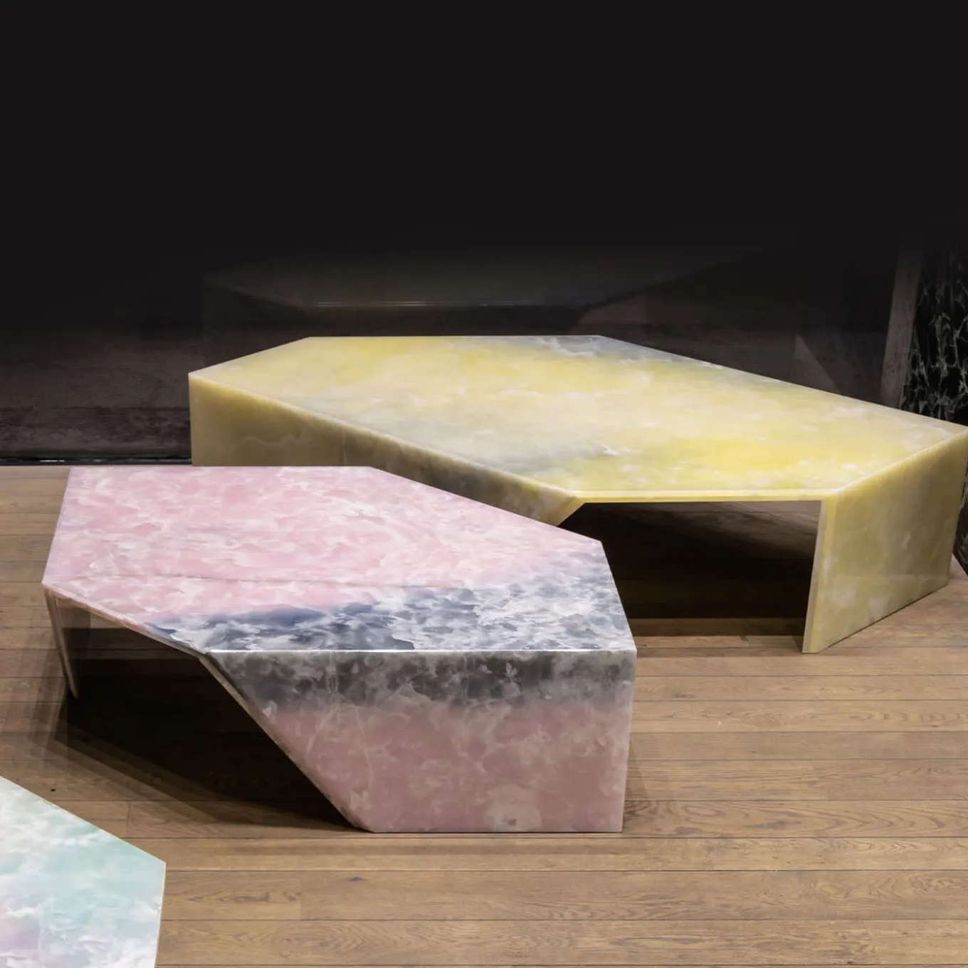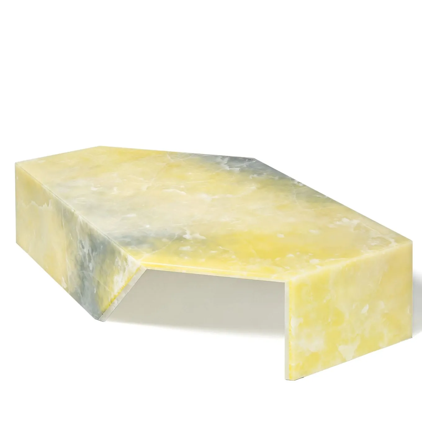 Rigorosamente piegato per creare una struttura autoportante poeticamente ispirata all’arte degli origami, questo tavolino da caffè è realizzato in pregiata onice bianca iraniana e incanta con le sue vibranti sfumature di giallo pulcino, verde lime e blu, ottenute con un abile processo di acquerello manuale. L’imprevedibile motivo a nuvola che l’onice sfoggia naturalmente sottolinea ulteriormente la sua unicità.