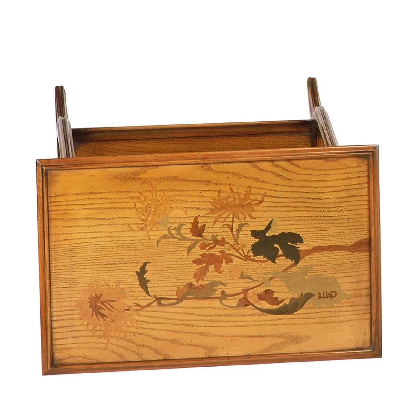 Riproduzione impeccabile di un pezzo Art Nouveau (1880-1915) originariamente disegnato da Emile Gallè, questo tavolino rettangolare è una soluzione raffinata per completare un arredamento di ispirazione classica. Tre elementi affusolati caratterizzano i fianchi aperti, che sostengono il piano con intarsi esotici e si appoggiano a terra per mezzo di piedini leggermente curvi. Un pratico ripiano inferiore offre ulteriore spazio.