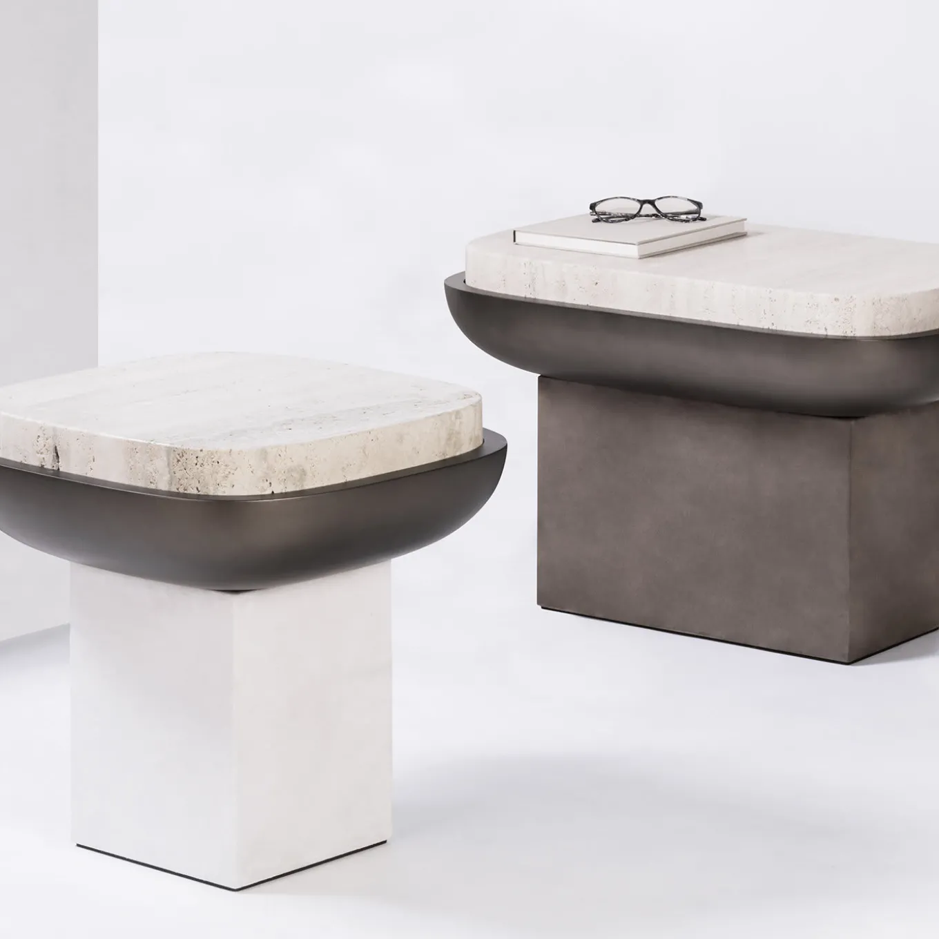 Inserito in uno studio privato, in un soggiorno o in un salotto, questo raffinato tavolino vanta un accattivante mix di texture e materiali in una silhouette minimale che rende omaggio sia all’architettura sensuale di Oscar Niemeyer sia all’architettura tradizionale orientale. Realizzato a mano in legno massiccio, la gamba a colonna è rivestita in pelle scamosciata color taupe (anche nappa e vitello stampato) e sostiene una seduta laccata color bronzo sormontata da una lastra di pregiato marmo travertino. Questo pezzo può essere esposto come pezzo unico o abbinato agli altri pezzi della collezione Olympia.