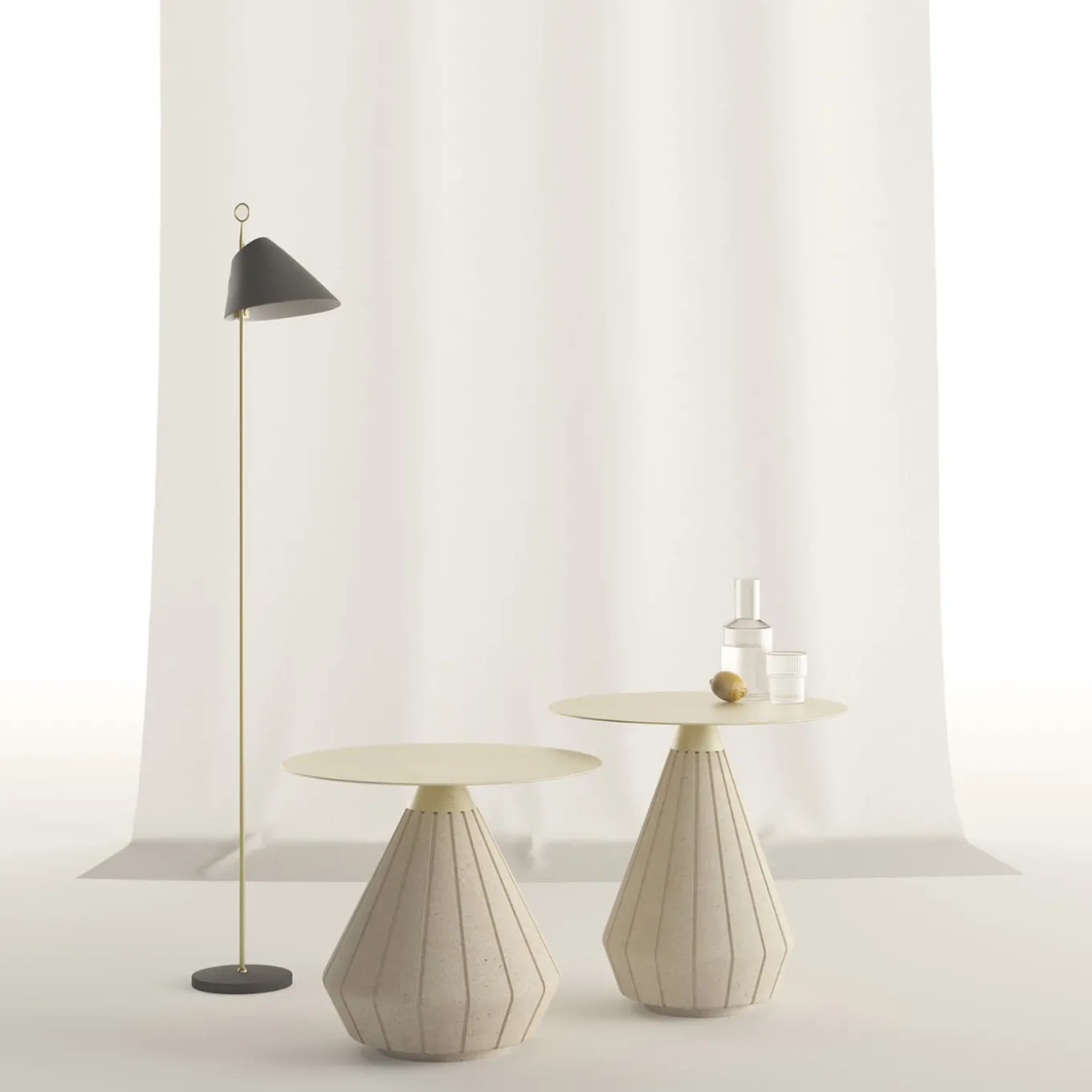 Ispirati ai frutti della natura, i tavolini Rigo, disponibili in due dimensioni, hanno una forma scultorea, scandita da sottili incisioni nella pietra Pimar, liscia e setosa, in dialogo con il metallo, in diverse finiture. La finitura del piano è in ferro zincato. Disponibile anche in ottone. Nel suo stile unico e contemporaneo, progettato da Apospersano per il Salone del Mobile Milano 2023.