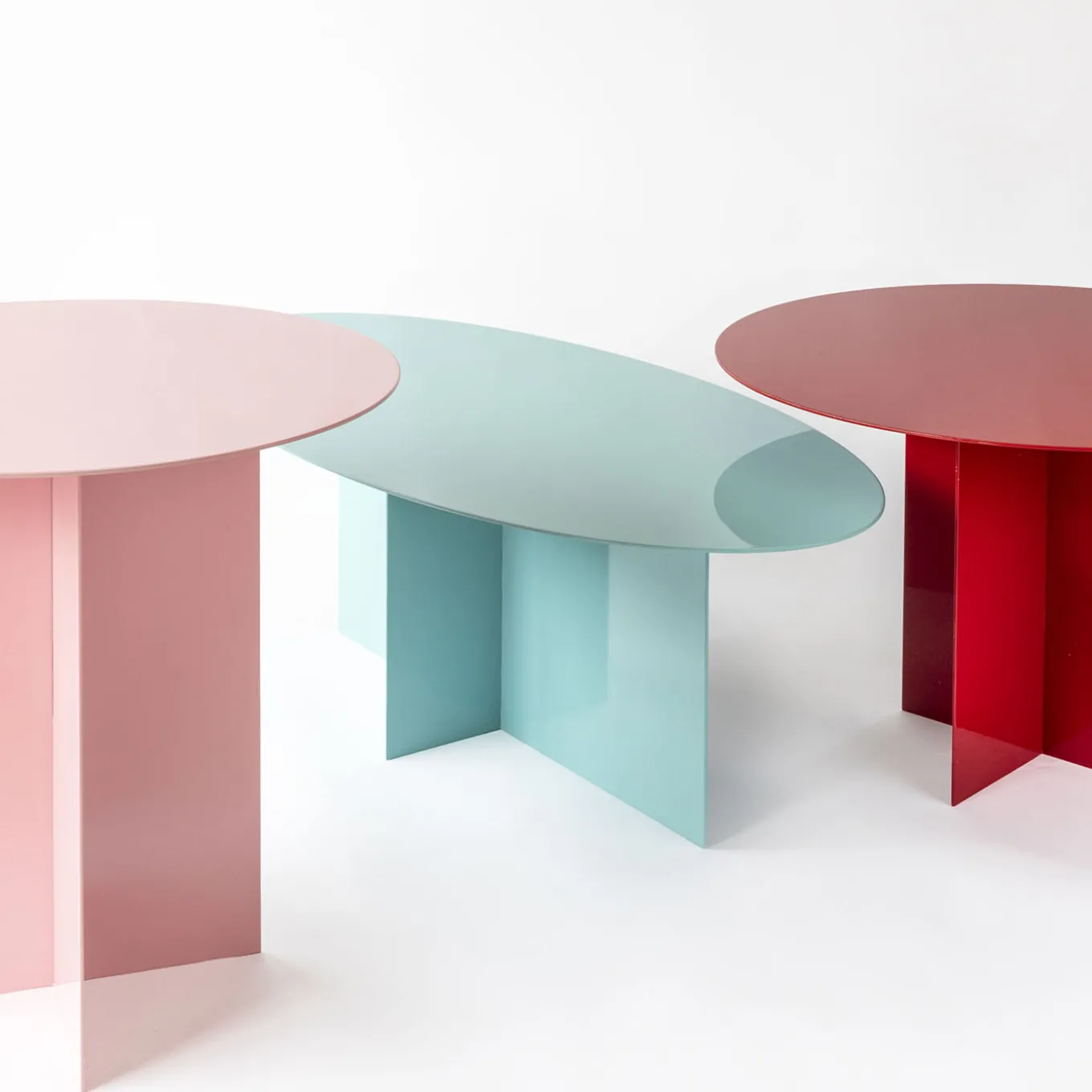 Un origami di ferro che sembra leggero, un gioco di forme a croce e superfici di qualsiasi forma geometrica definiscono questa collezione di tavoli, caratterizzati da un colore comune. La base a croce si adatta a qualsiasi forma del piano, tutti prodotti con una lastra metallica di 3 mm di colore personalizzabile, un progetto in divenire, un gioco di costruzioni in cui l’utente finale è libero di creare il proprio tavolo personalizzato, un progetto nel progetto. Per qualsiasi personalizzazione di dimensioni e colori, rivolgersi al Servizio Concierge.