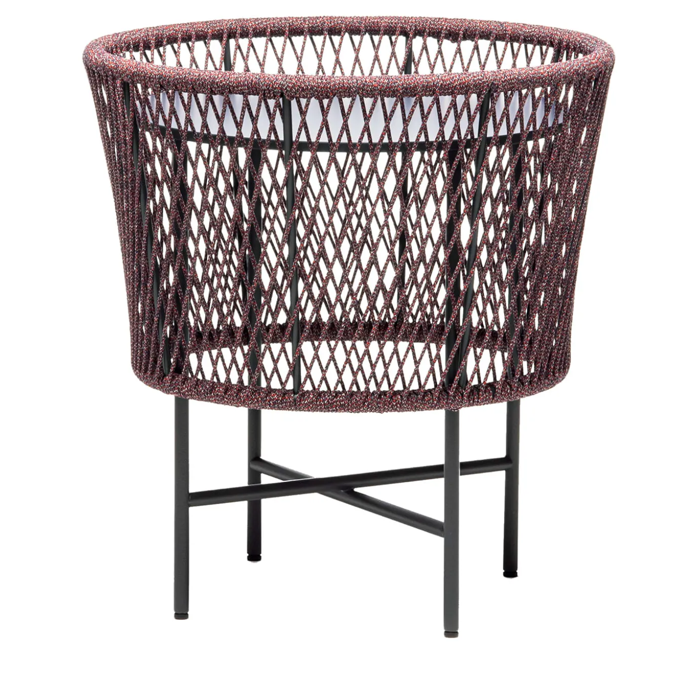 Un intricato tracciato a diamante ottenuto dall’intreccio di corde marine viola – avvolte anche intorno ai bordi di una conchiglia a forma di tamburo – definisce questo elegante tavolo d’accento adatto all’uso esterno. Il piano rotondo con finitura blu è incassato all’interno, dove può sostenere una lanterna o un gruppo di candele accese. Tutti gli elementi sono montati sulla struttura generale in acciaio verniciato a polvere in grigio antracite. Per altri colori, consultare il catalogo Artemest.