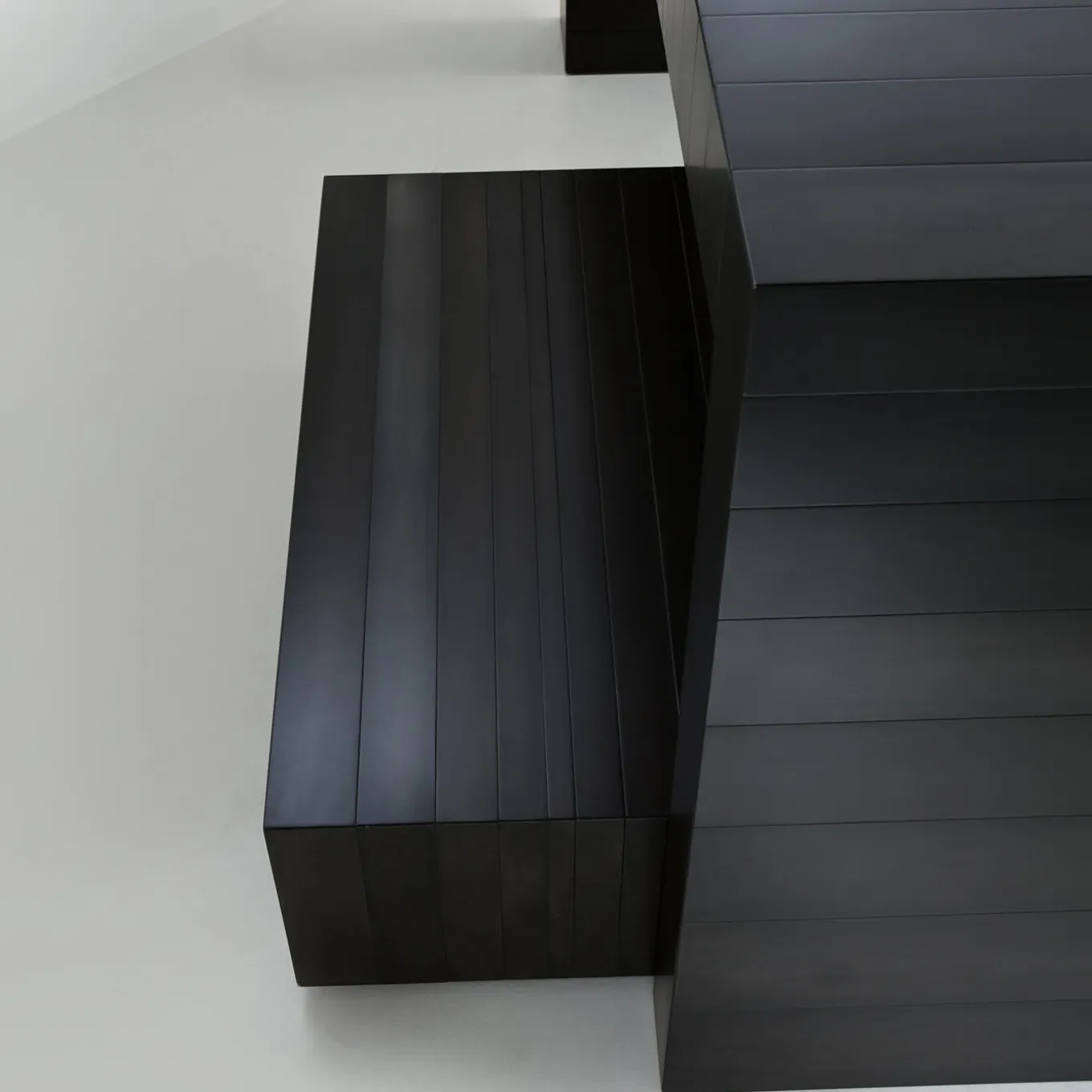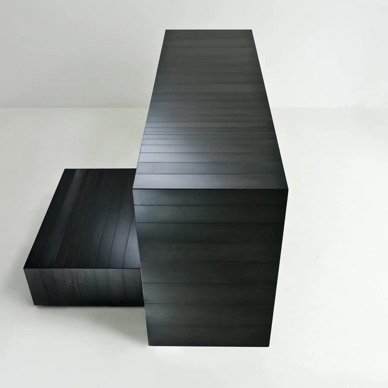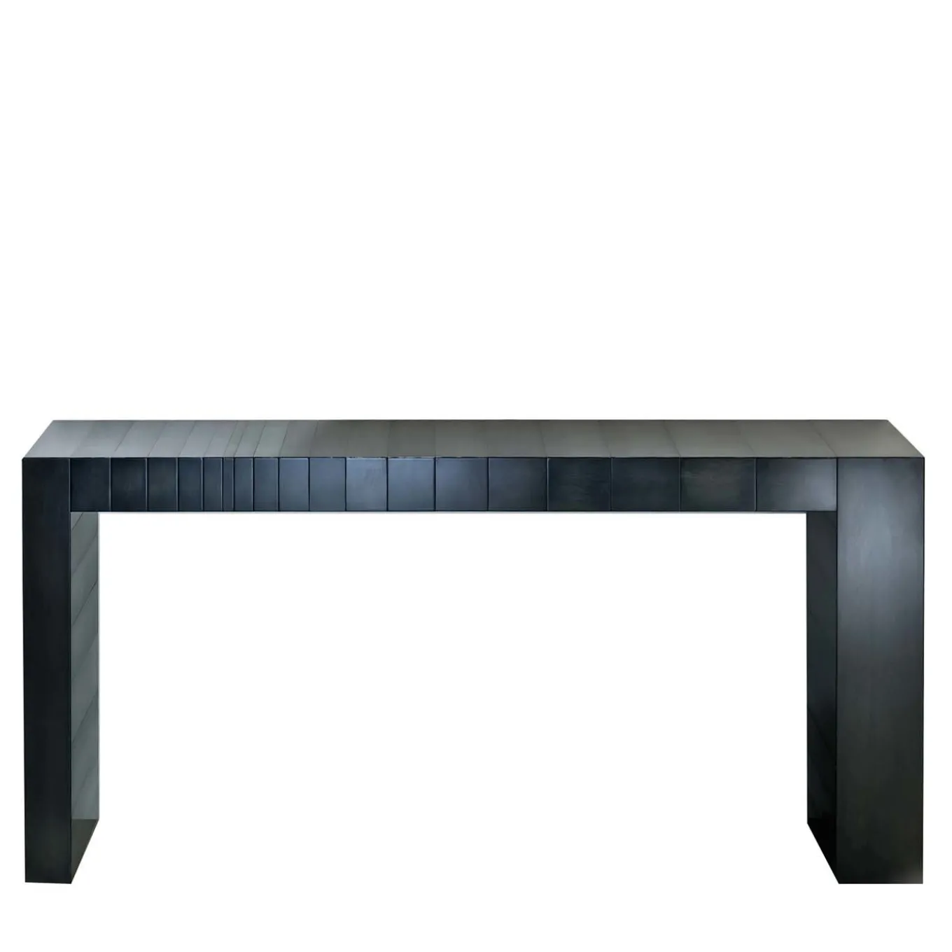 Linee semplici percorrono verticalmente il piano e i lati portanti di questa consolle solida e moderna, conferendole movimento e un aspetto moderno. Sia i lati che il piano di questo pezzo sono interamente rifiniti in metallo nero, e sono disponibili diverse finiture. Questo pezzo aggiungerà un tocco di design a qualsiasi casa o ufficio.